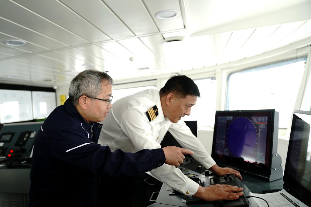 4月20日,“同济”号南海春季航次首席科学家田军教授(左)和“同济”号船长石斌(右)商量考察站位工作。新华社记者张建松 摄