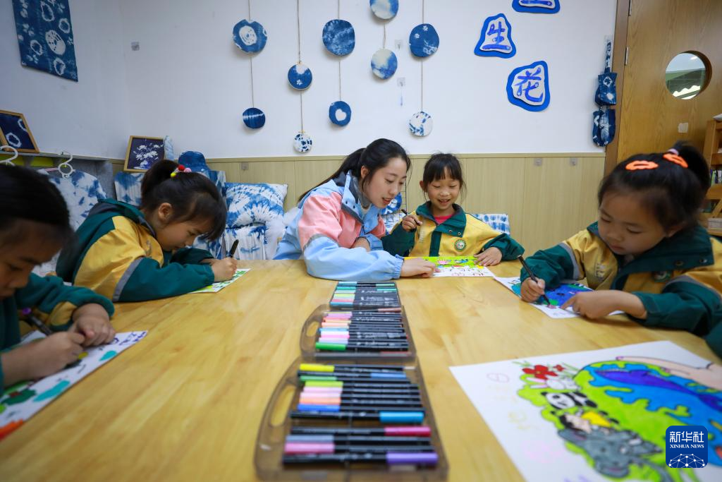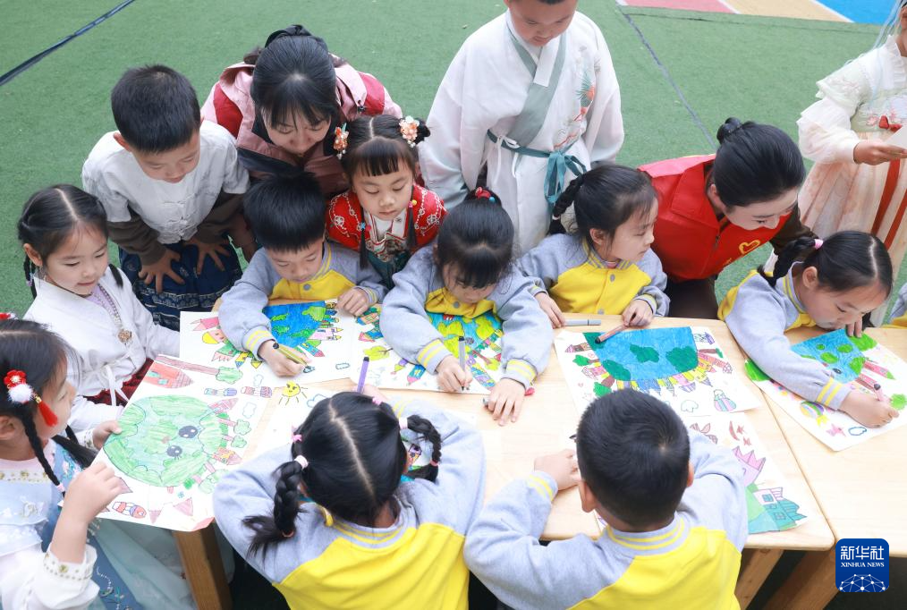 4月22日,在湖北省武汉市江岸区百步亭快乐天使幼儿园,孩子们以画笔绘山河。新华社发(赵军摄)