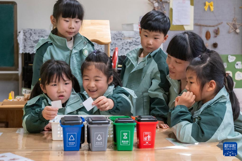 4月21日,在安徽省芜湖市繁昌区春谷幼儿园,小朋友学习垃圾分类知识。新华社发(肖本祥摄)