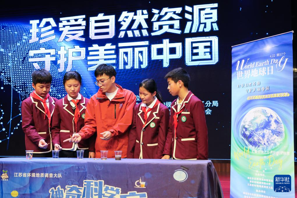 4月21日,地质工作者在江苏省海安市城南实验小学指导同学们进行科学小实验。新华社发(顾彬斌摄)