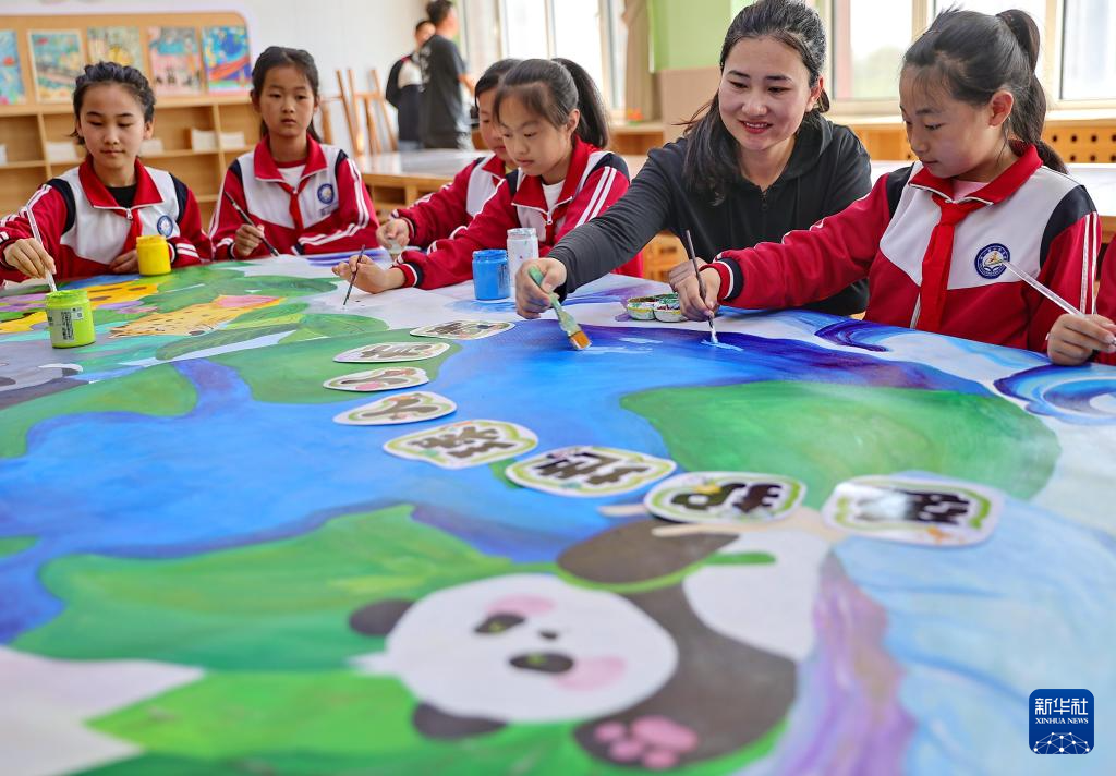 4月21日,河北省秦皇岛市海港区新一路小学集团产业新城第一小学教师带领学生绘制环保主题长卷。新华社发(曹建雄摄)