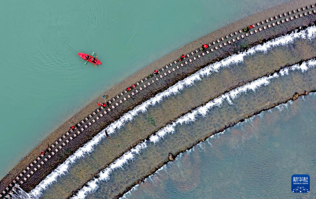 4月21日,浙江省交通集团高速公路台州市仙居收费站党员、志愿者与河长一起在仙居县永安溪清理杂物垃圾、打捞水面漂浮物(无人机照片)。新华社发(王华斌摄)