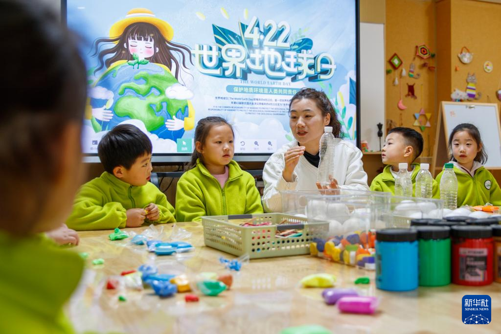 4月21日,在河南省商丘市睢县古襄路幼儿园“童心护地球 共绘绿色梦”主题活动现场,小朋友学习环保科普知识,参与“变废为宝”手工制作。新华社发(徐泽源摄)
