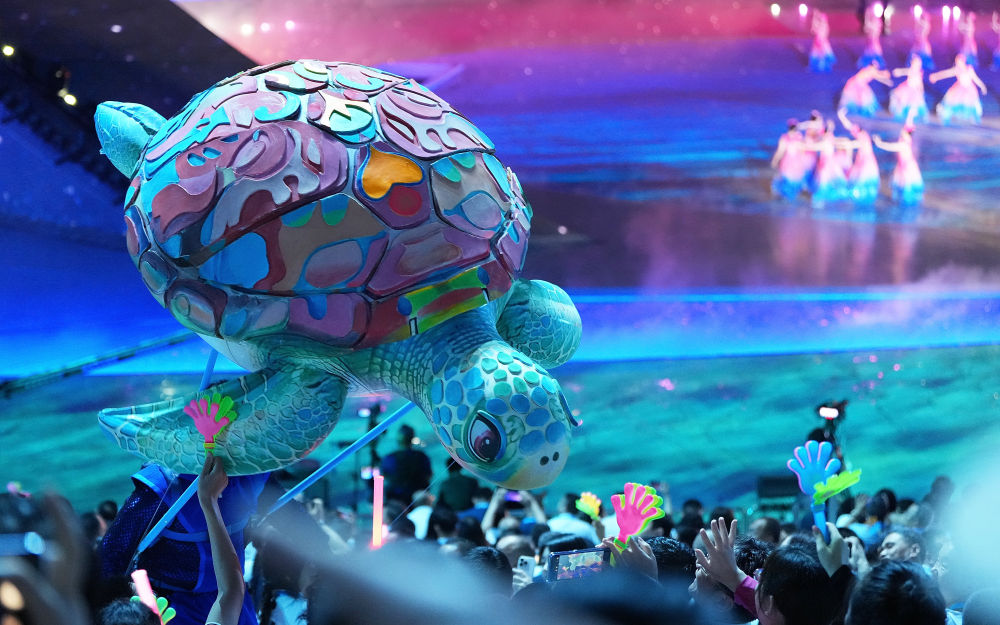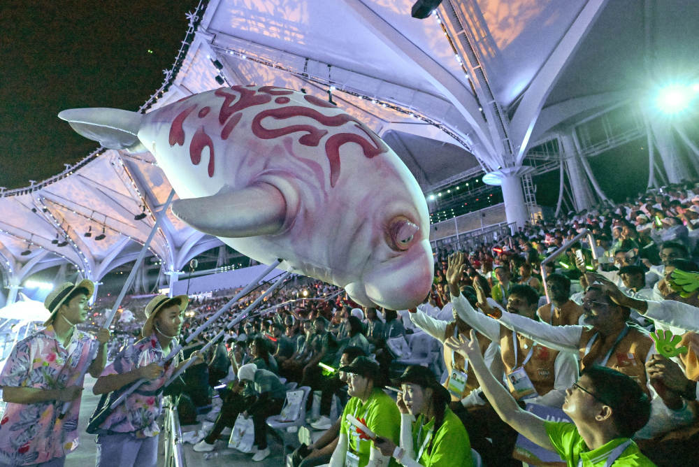 4月22日,演员操作海洋生物模型在第六届亚洲沙滩运动会开幕式上与观众互动。新华社记者 杨冠宇 摄