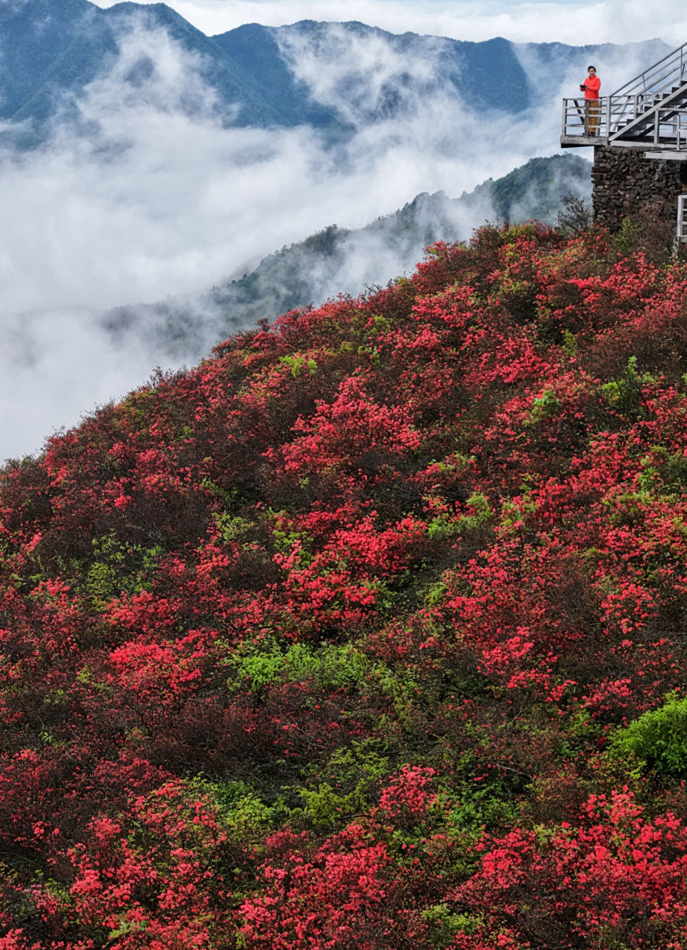 ↑ 4月23日,游客在湖南省永州市双牌县阳明山国家森林公园杜鹃花海赏花游玩。新华社发(周秀鱼春摄)