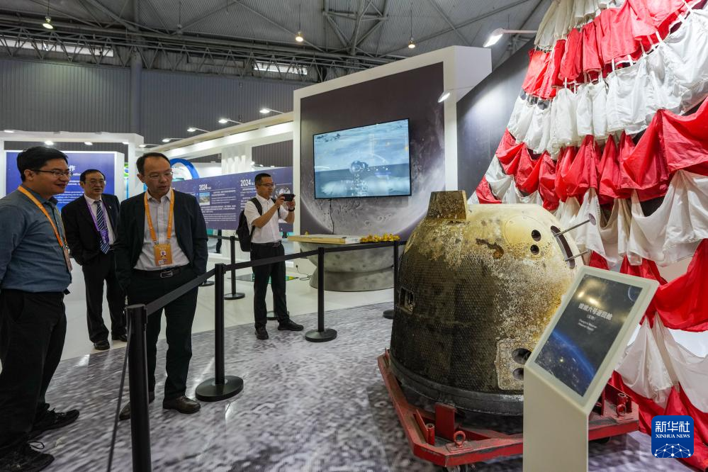 4月24日,参会嘉宾在航天科普展览上参观嫦娥六号返回舱。新华社记者 王曦 摄