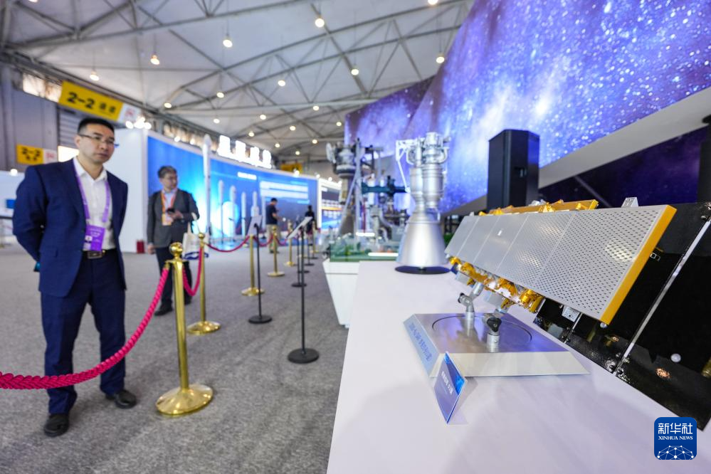 4月24日,参会嘉宾在航天科普展览四川航天展区参观卫星展品。新华社记者 王曦 摄