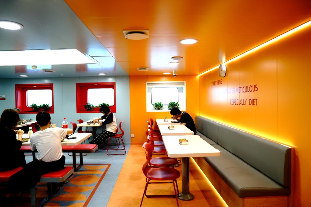 登船以后,令人印象最深的是船上生活的现代时尚。明快的红黄两色装饰的餐厅,让人赏心悦目,尤其是每天的饭菜可口,花样很多,更令人食欲大增;精致的图书馆一角,还优雅地放置了一台钢琴;畅通的WIFI覆盖全船每一处角落,让出海再也不会失联。