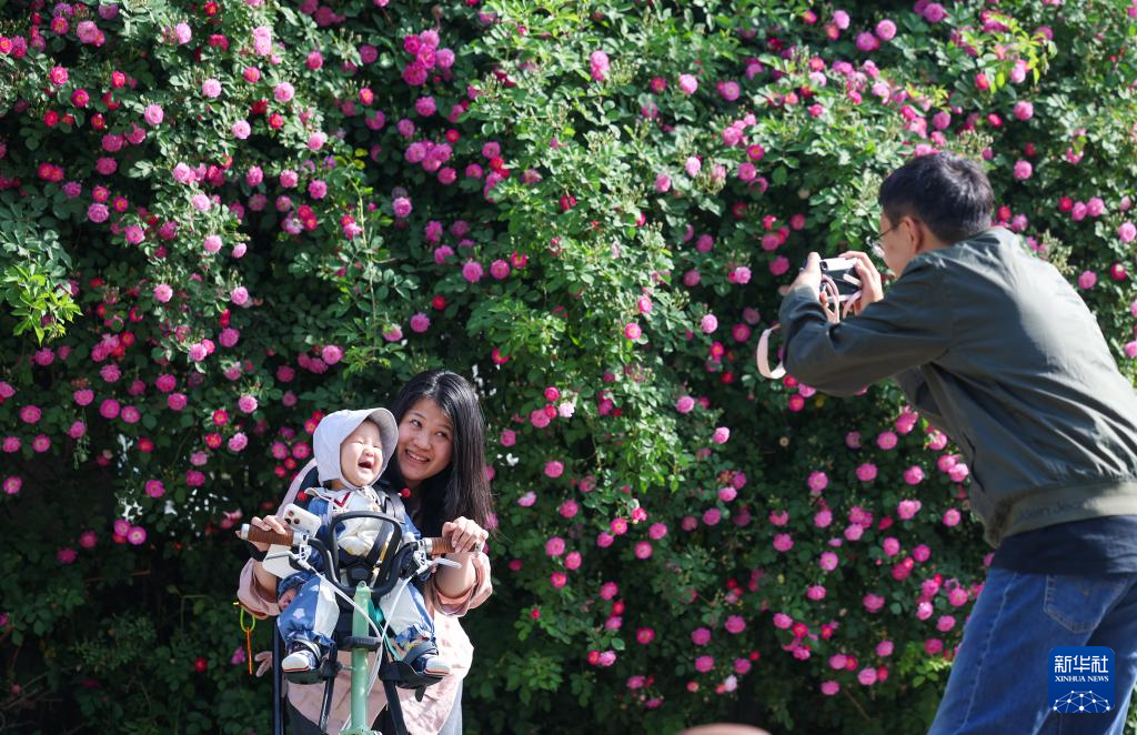 4月24日,市民在河北省石家庄市一处蔷薇花墙前赏花拍照,乐享亲子时光。新华社发(梁子栋摄)