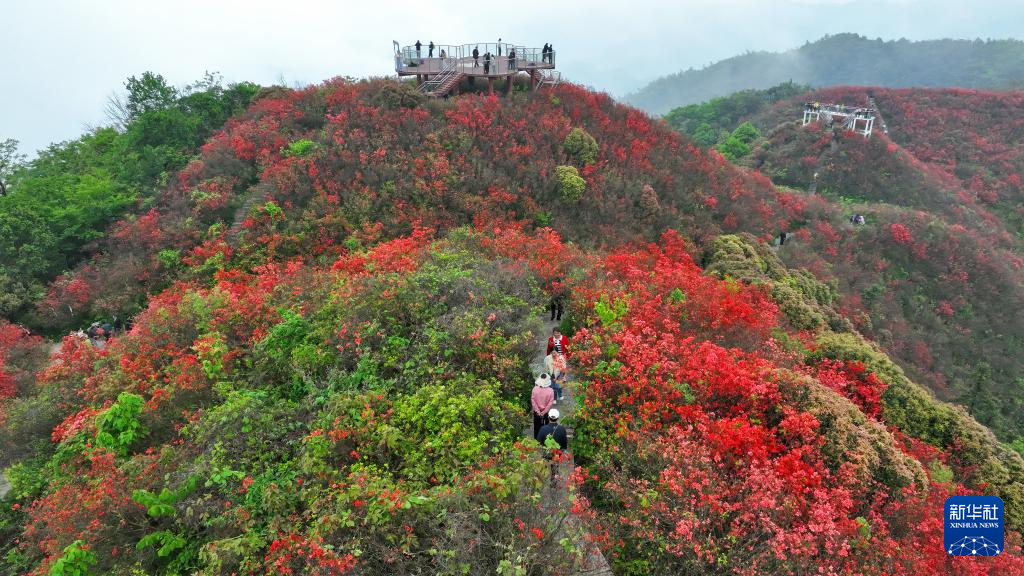 4月24日,人们在江西省萍乡市湘东区广寒寨乡四八门景区内欣赏杜鹃花(无人机照片)。新华社发(李桂东摄)