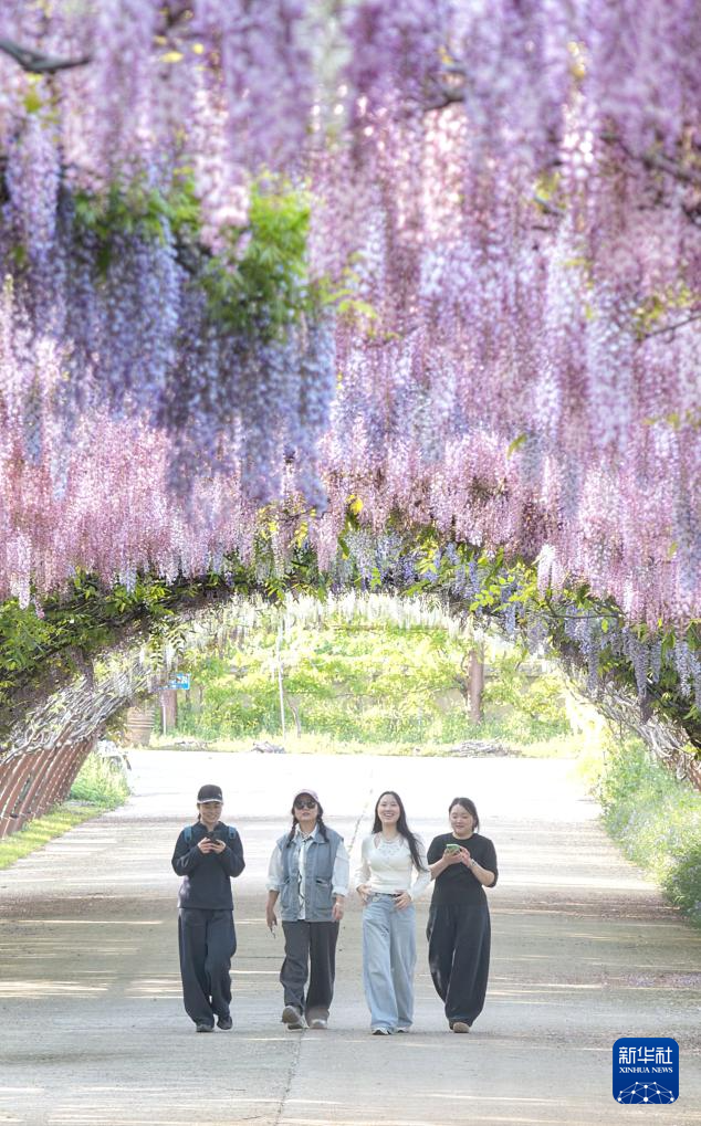 4月24日,人们在江苏南通洲际梦幻岛紫藤花谷欣赏盛开的紫藤花。新华社发(许丛军摄)