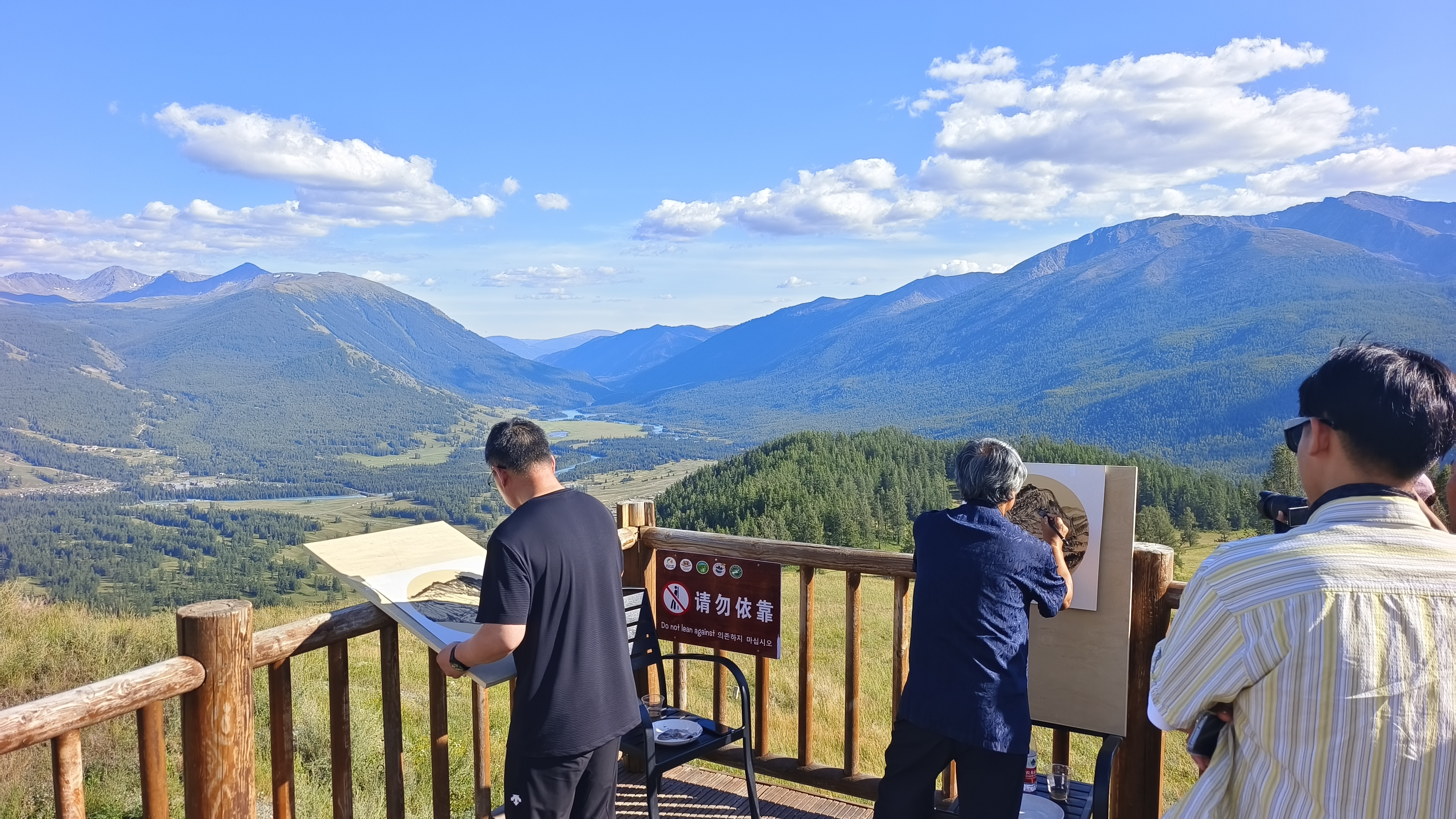 走进布尔津县风景如画的喀纳斯景区,画家老师们纷纷拿出笔墨,在画板上勾勒出一幅幅美妙的图案。从山川到湖泊,每一笔都蕴含着深厚的情感和精湛的技艺,现场游客无不被画家的专注和创造力所打动,不时发出阵阵赞叹。“梦中的新疆变成了现实,新疆的美景映入我的眼帘,此时此刻我的心情非常激动,我想把美丽的青山化为我的作品,变成我笔下抒情达意的壮丽山水。来到新疆阿勒泰,天蓝云白水绿山青,环境美人更美,希望天南地北的朋友们都能来新疆走一走。以后有机会,我还会再来新疆,继续用我的画笔记录这壮美山河。”东北师范大学美术学院教授张建华说。