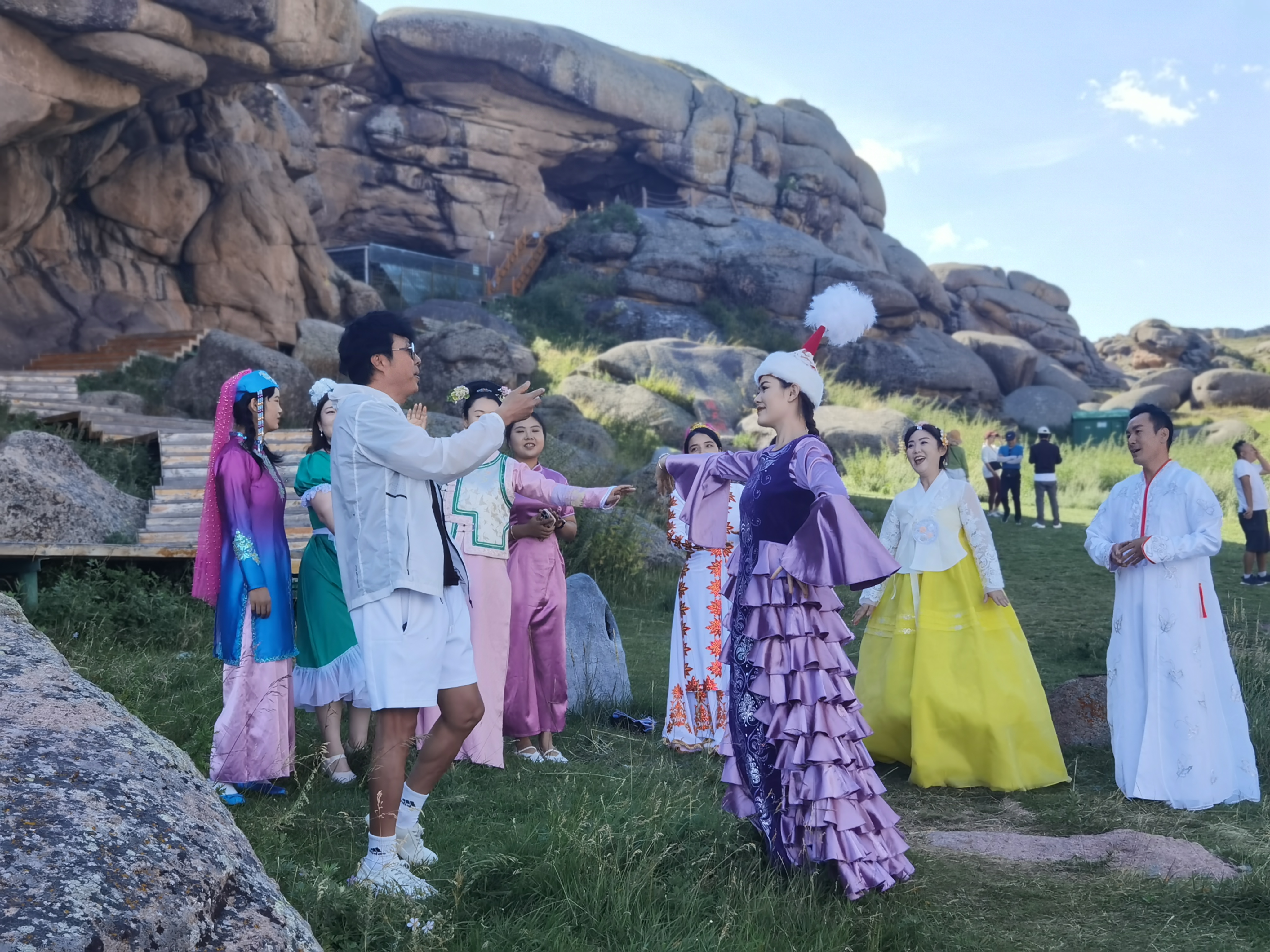 在“中哈边境第一村”吉木乃县吉木乃镇萨尔乌楞村,采风团成员为村民们送上的精彩文艺演出,让现场观众大饱眼福。在吉木乃通天洞遗址,大家身着少数民族服饰,载歌载舞、打卡拍照。
