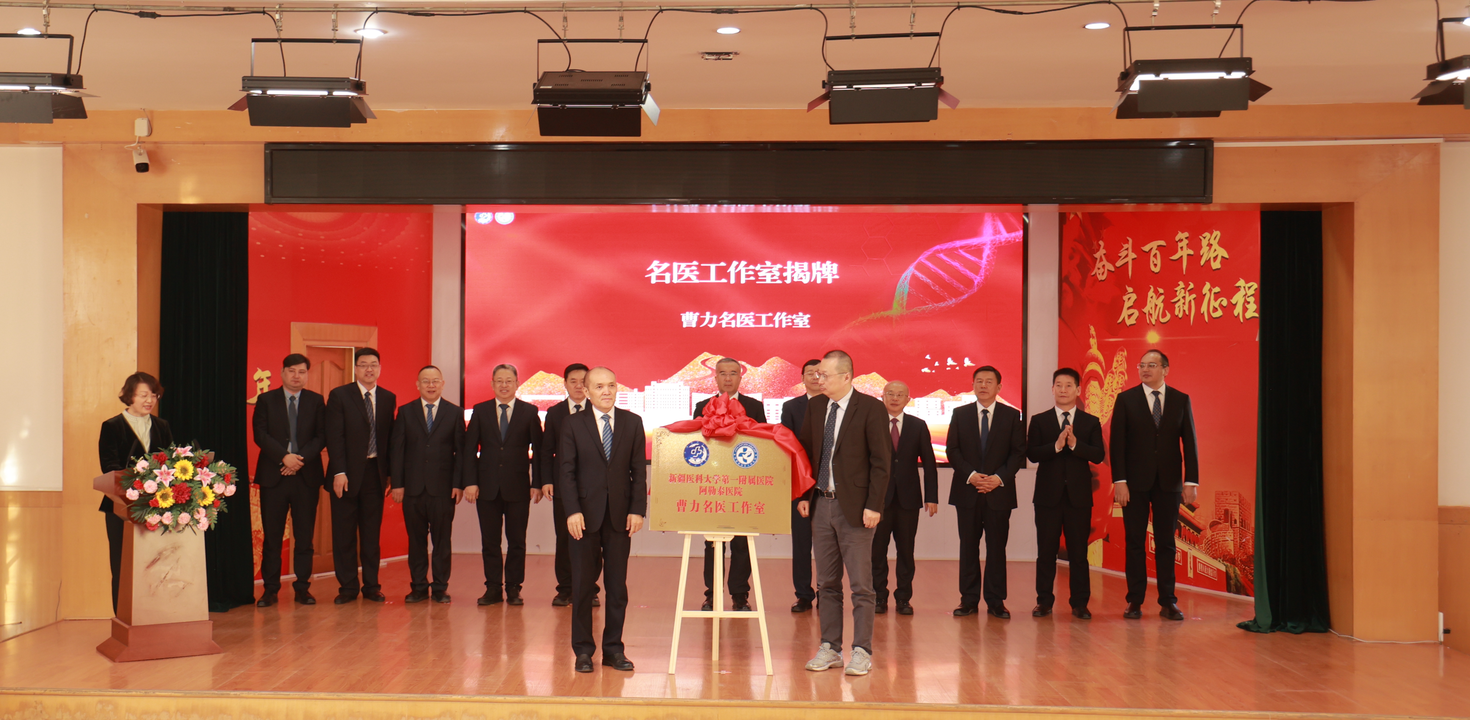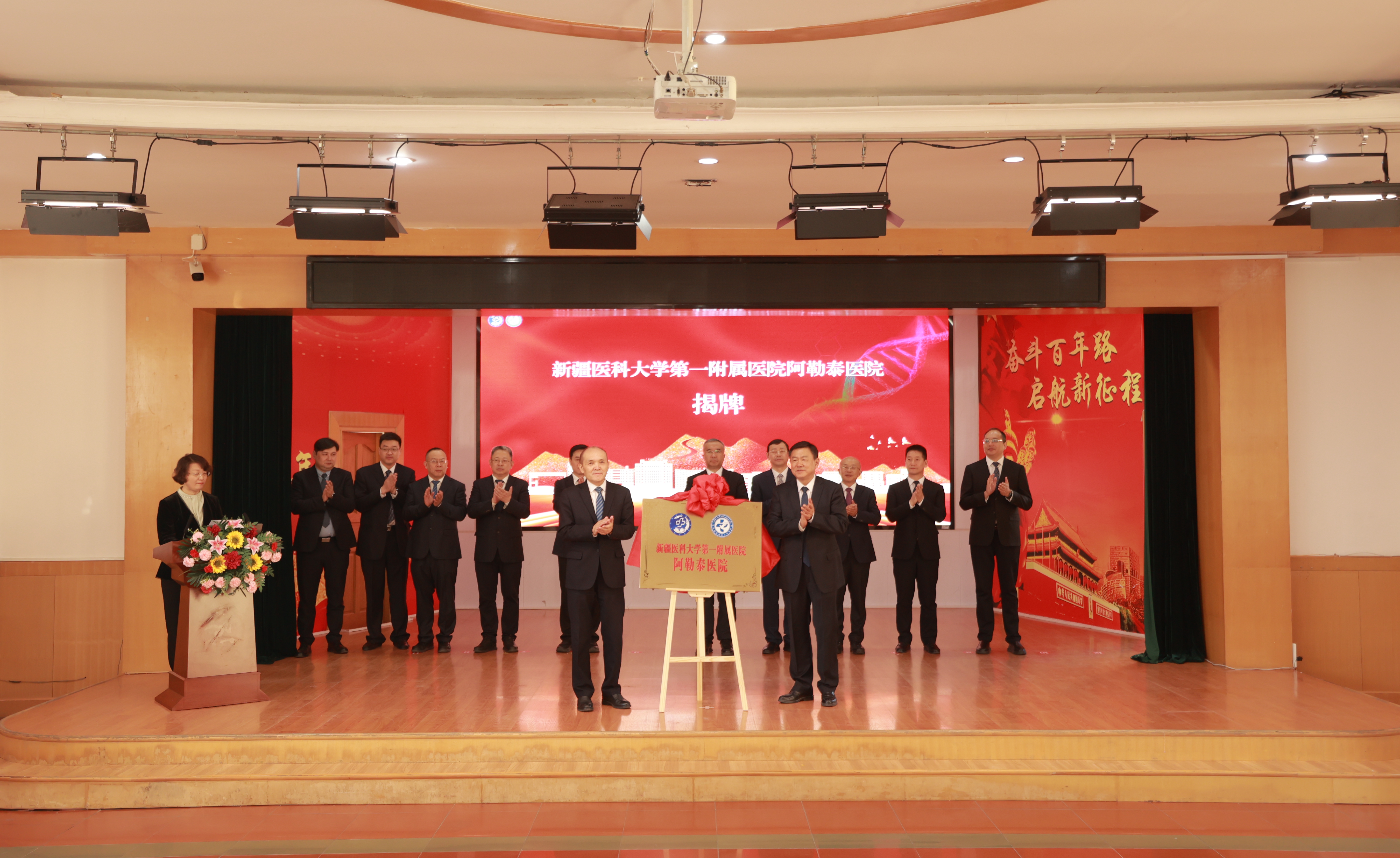 新疆医科大学党委书记柴林,阿勒泰地委副书记、行署专员杰恩斯·哈德斯为新疆医科大学第一附属医院阿勒泰医院揭牌。