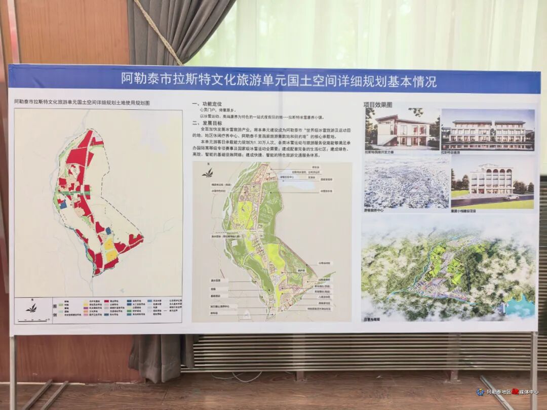 阿勒泰市拉斯特乡 “康养小镇” 文化旅游单元的规划展板,详细展示了该单元的布局与发展规划,吸引众人关注。