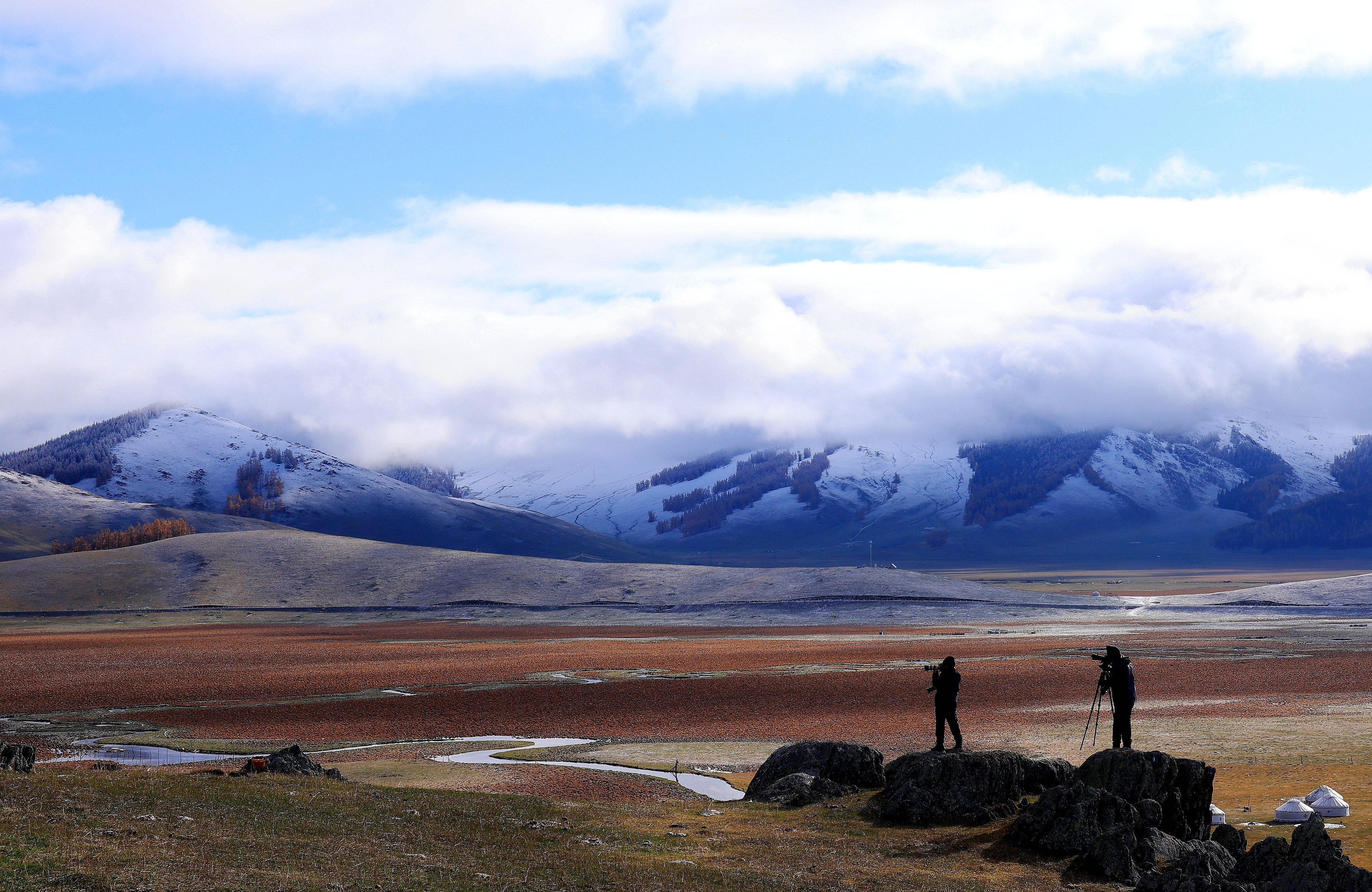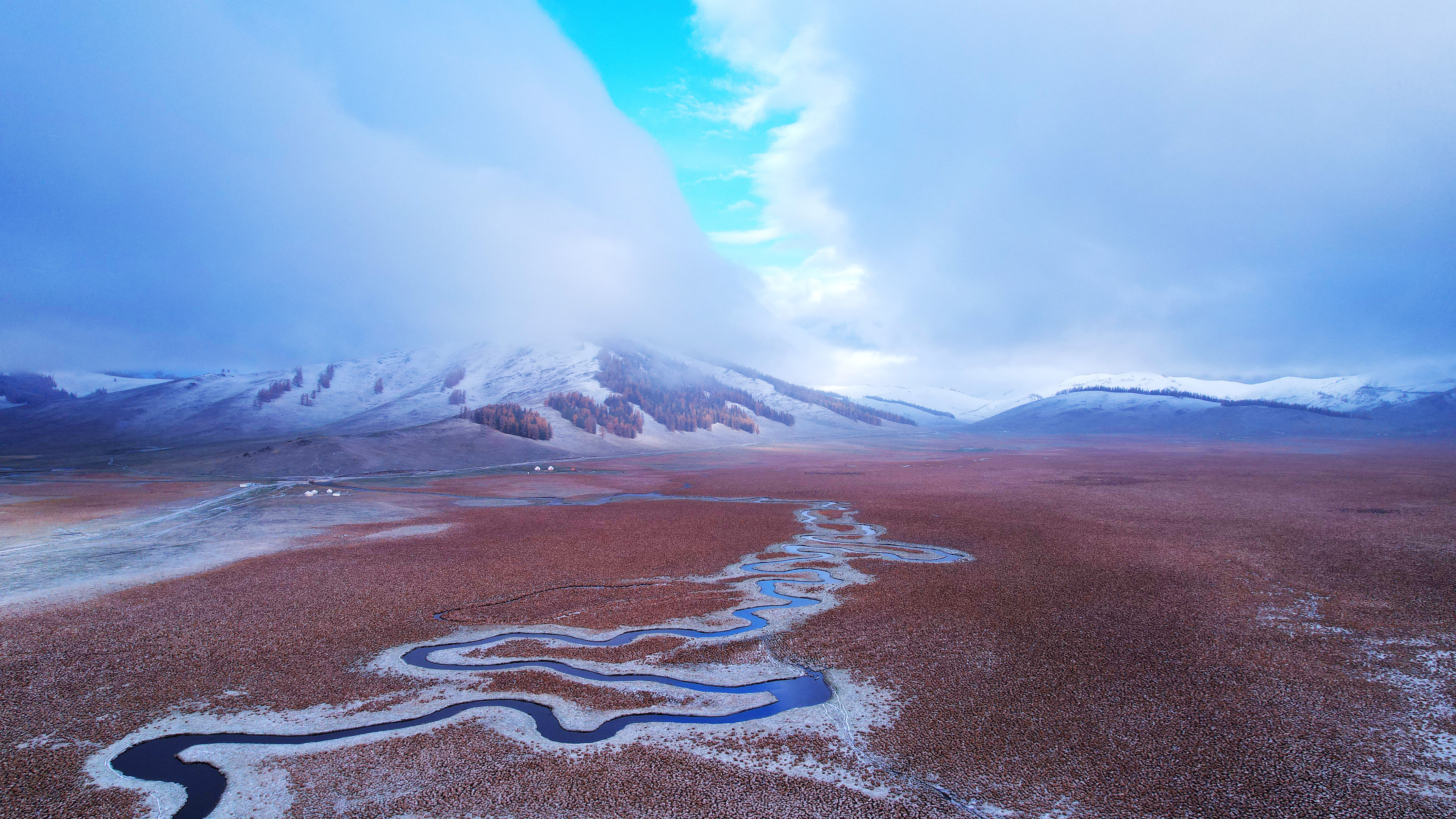 阿勒泰新闻网-阿勒泰地区融媒体中心(记者 阿尔达克·拜斯汗)深秋时节,位于阿禾公路沿线的托勒海特草原在一场雨雪后,呈现出如梦如幻的云海景观。站在观景台远眺,可见云流顺势而下,如瀑布般倾泻,与金黄色的草原相互映衬,构成一幅动人的自然画卷。翻腾的云海把草原装点成仙境,成为摄影爱好者与游客争相打卡的绝美胜地。