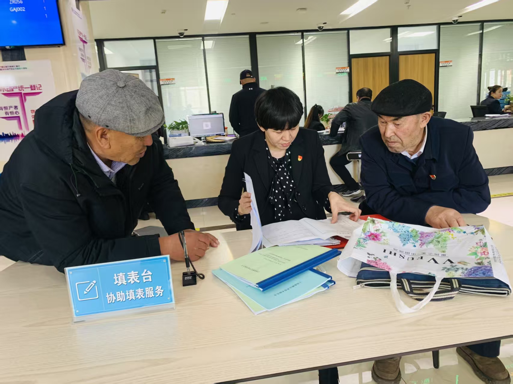 阿勒泰地区行政服务中心党员志愿者(中)帮助群众整理资料。通讯员 王雪洁 摄