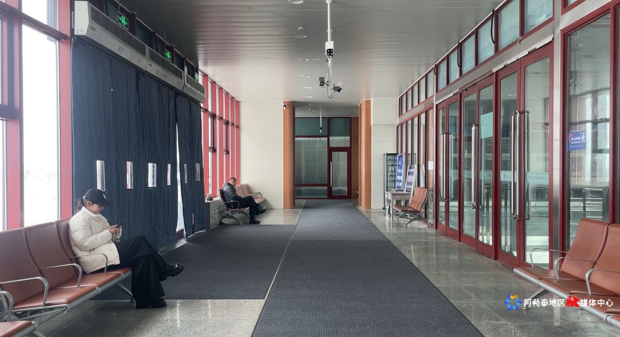 乘客在阿勒泰火车站候车厅旁有暖气及热水的廊道休息。
