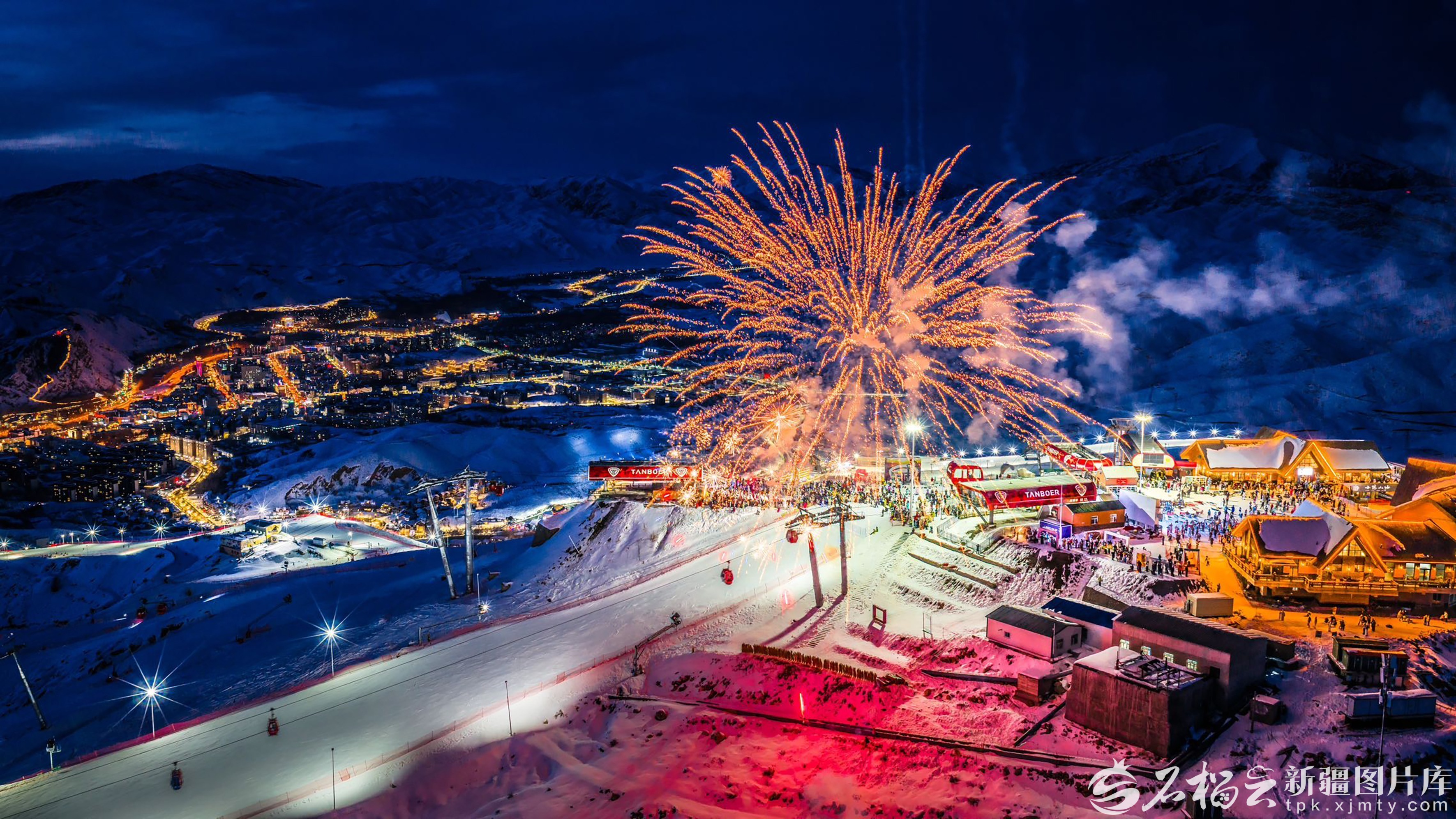 绚烂的烟花绽放在阿勒泰将军山国际滑雪度假区上空(1月3日无人机摄)。元旦假期,该滑雪度假区接待游客4.7万人次,单日游客量超过1.5万人次。 宋湖拉·沙布尔江摄