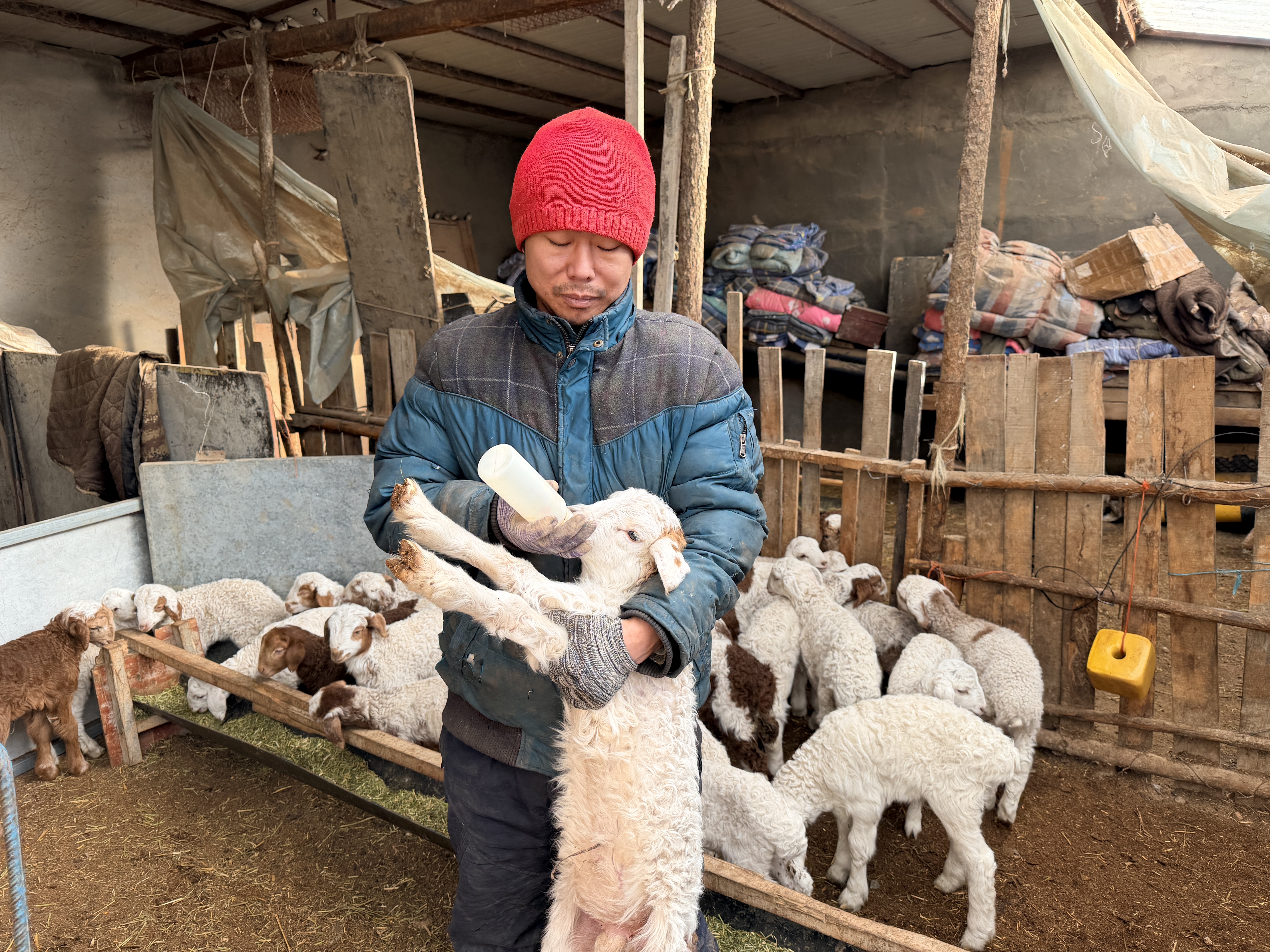 牧民孙振涛家正在照顾羊羔。通讯员 别尔德别克·纳仁汗摄