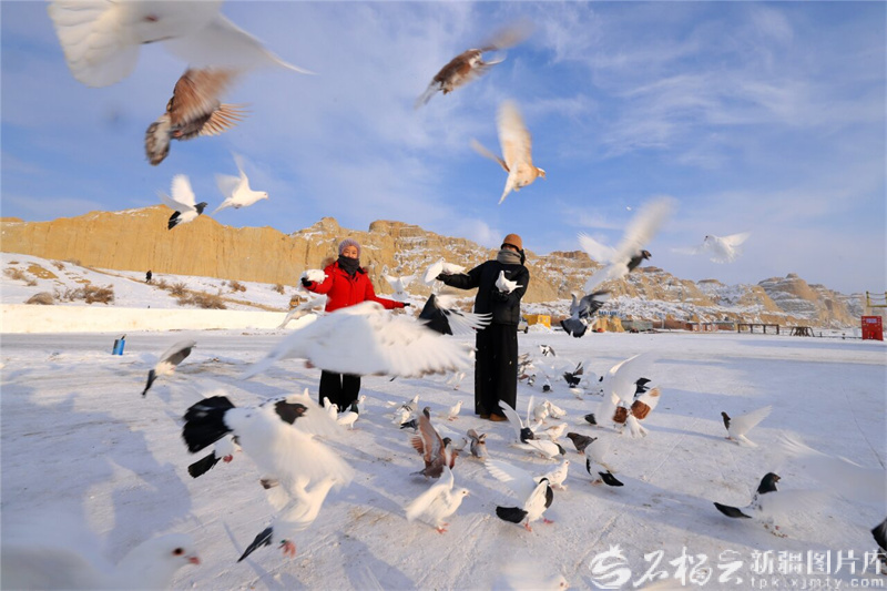 1月12日,游客在福海县乌伦古湖海上魔鬼城景区喂鸽子,享受冬日暖阳。该景区集地质奇观、民俗文化和冰雪体验于一体,推出雪地摩托、冰钓、VR互动等项目,吸引各地游客前来领略冬日冰雪魅力。通讯员阿尔达克·拜斯汗摄