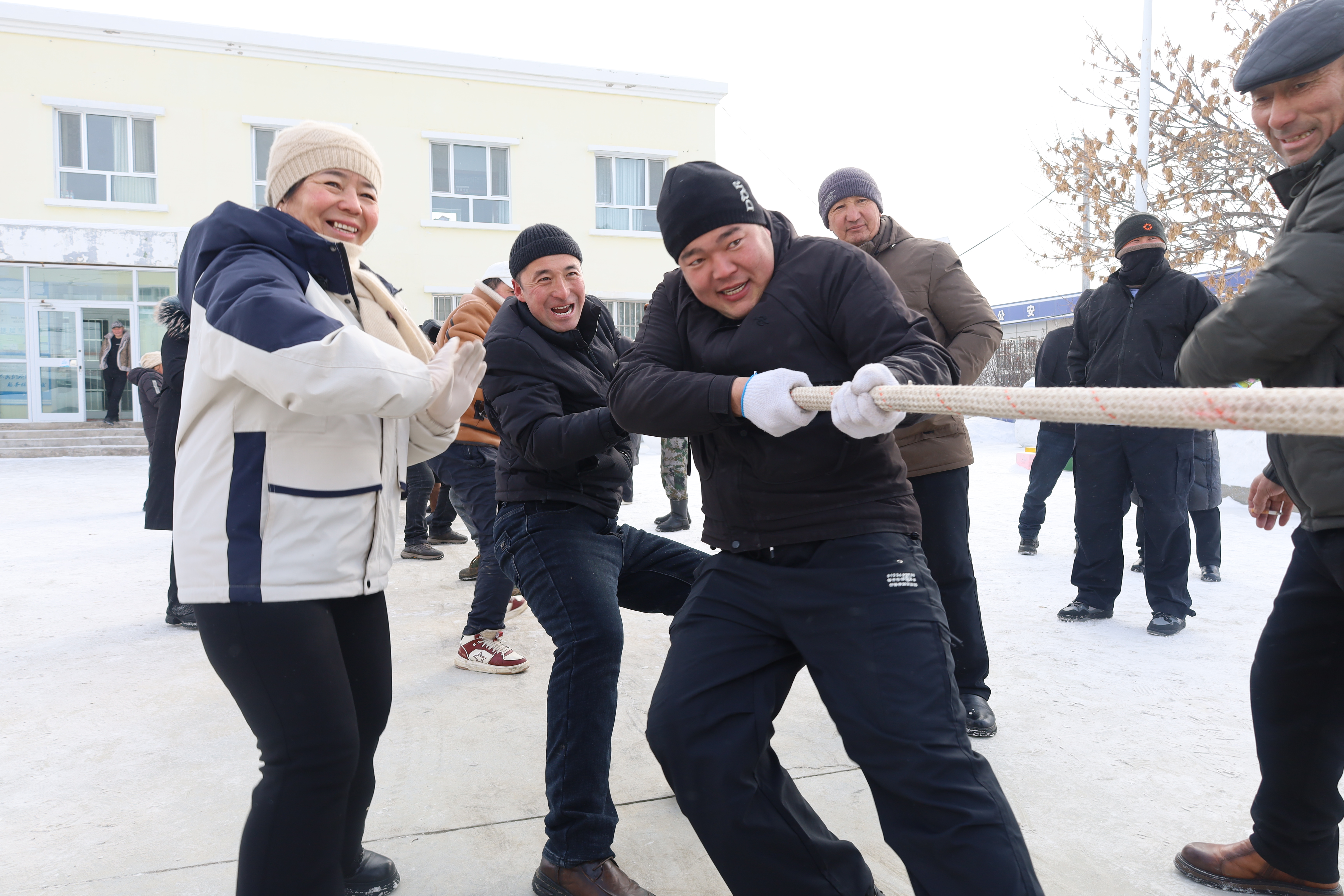 阿勒泰市巴里巴盖乡阔克尔图村村委会“群众村晚”文体活动现场,村民参加拔河比赛。