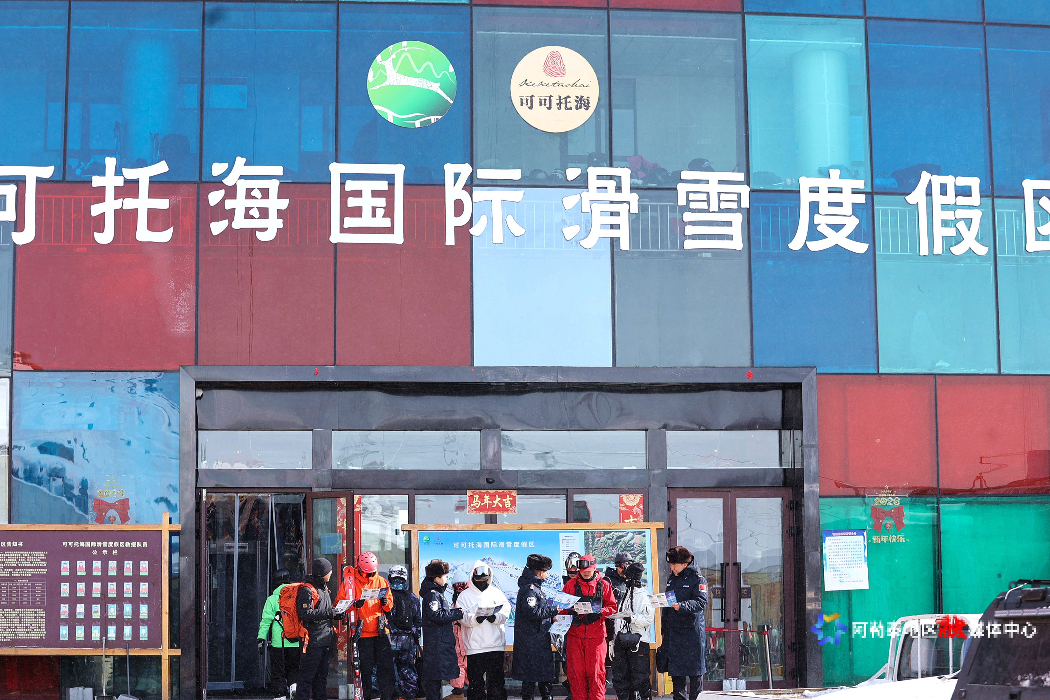 民警在富蕴县可可托海国际滑雪场对游客进行安全提醒和法律法规宣传。通讯员 李晋摄