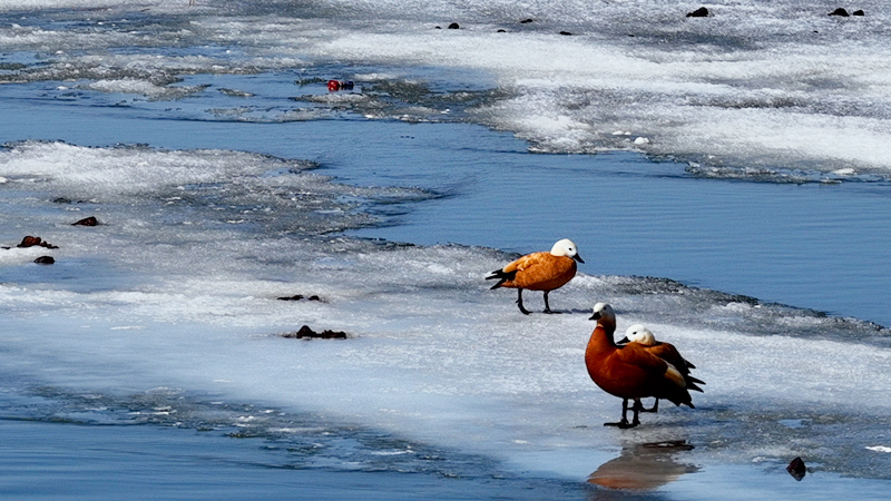 此次现身的赤麻鸭,是阿勒泰地区的常见鸟种,也是候鸟迁徙中最晚离开的鸟类之一。其全身栗黄色的羽色辨识度极高,颈部狭窄的黑色颈环与翼上醒目的白色斑形成鲜明对比,铜绿色的翼镜在阳光下熠熠生辉。它们偏好平原湖泊、河流及沼泽等淡水水域,常以数十只至数百只的群体活动,在浅滩和陆地间觅食,是湿地生态系统健康与否的重要“指示物种”。