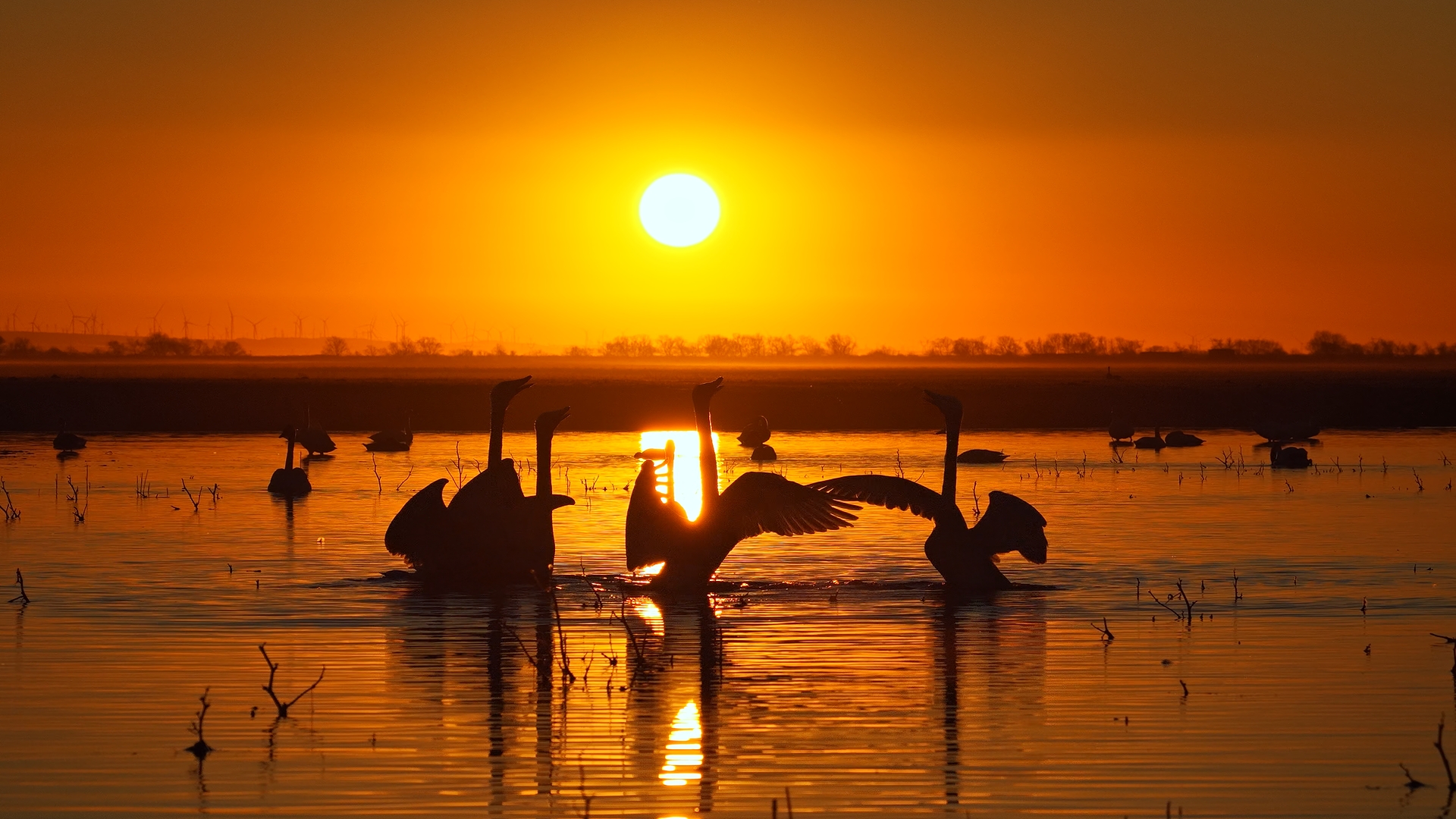成群大天鹅在湿地水域悠然嬉戏。