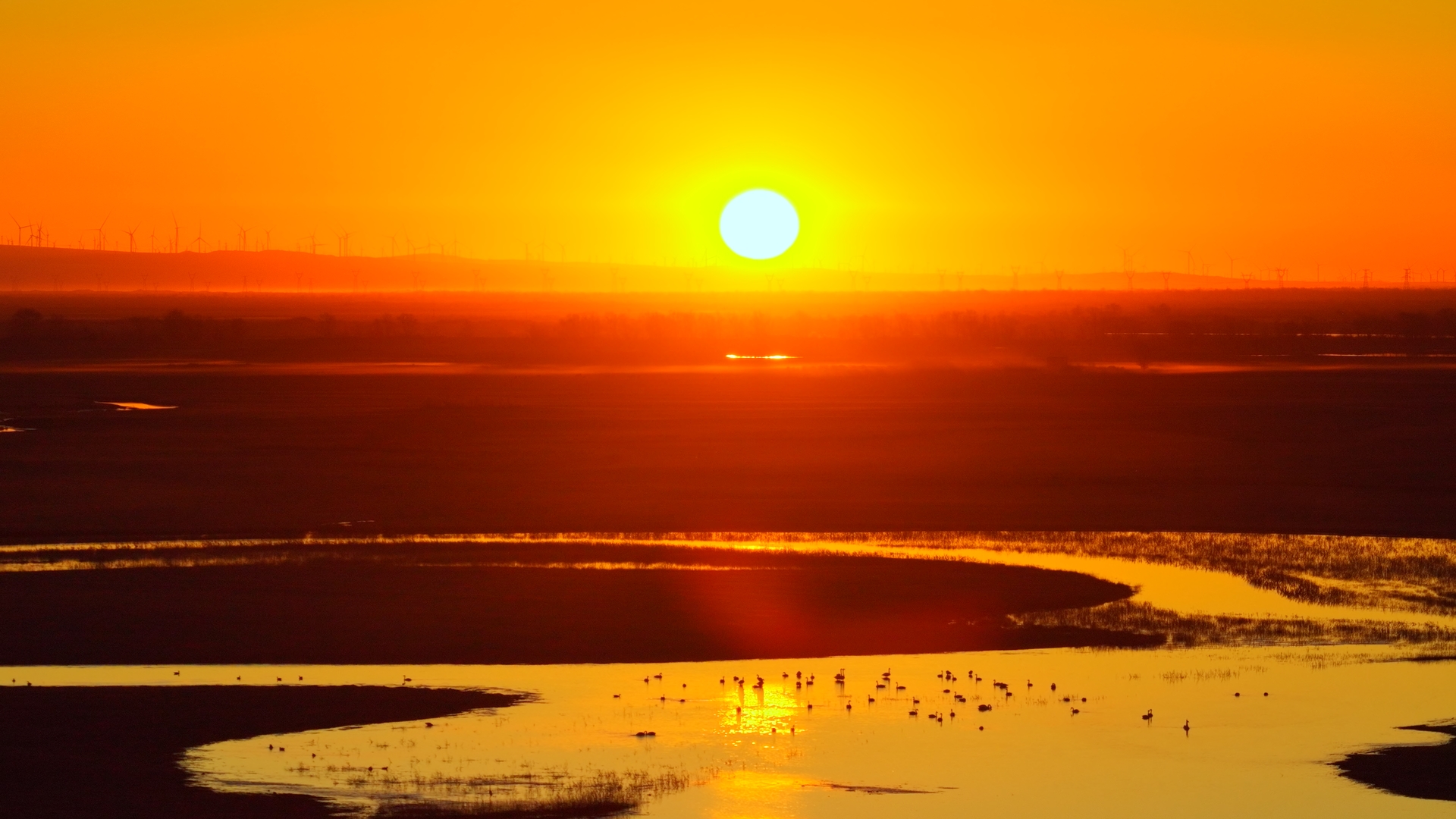 蜿蜒水湾间,成群水鸟栖息。