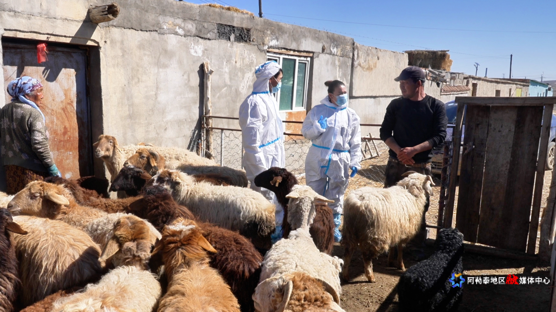 吉木乃县乌拉斯特镇齐阔尔加村,村级防疫员叶丽努尔·巴合道吾列提为村里最后两户牧民的上百只牛羊逐一接种口蹄疫疫苗。