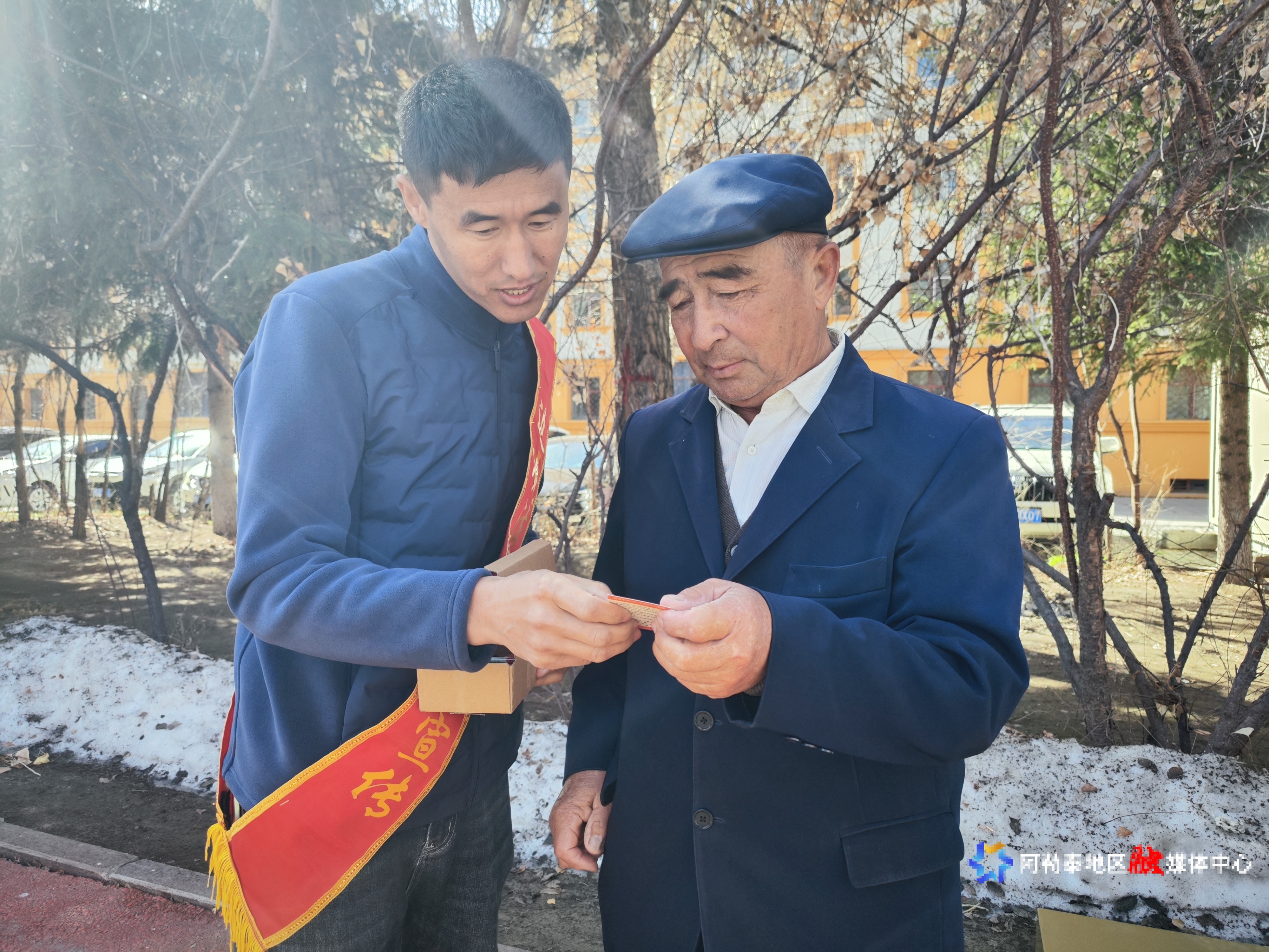 青河县委政法委工作人员为群众发放国家安全知识卡。