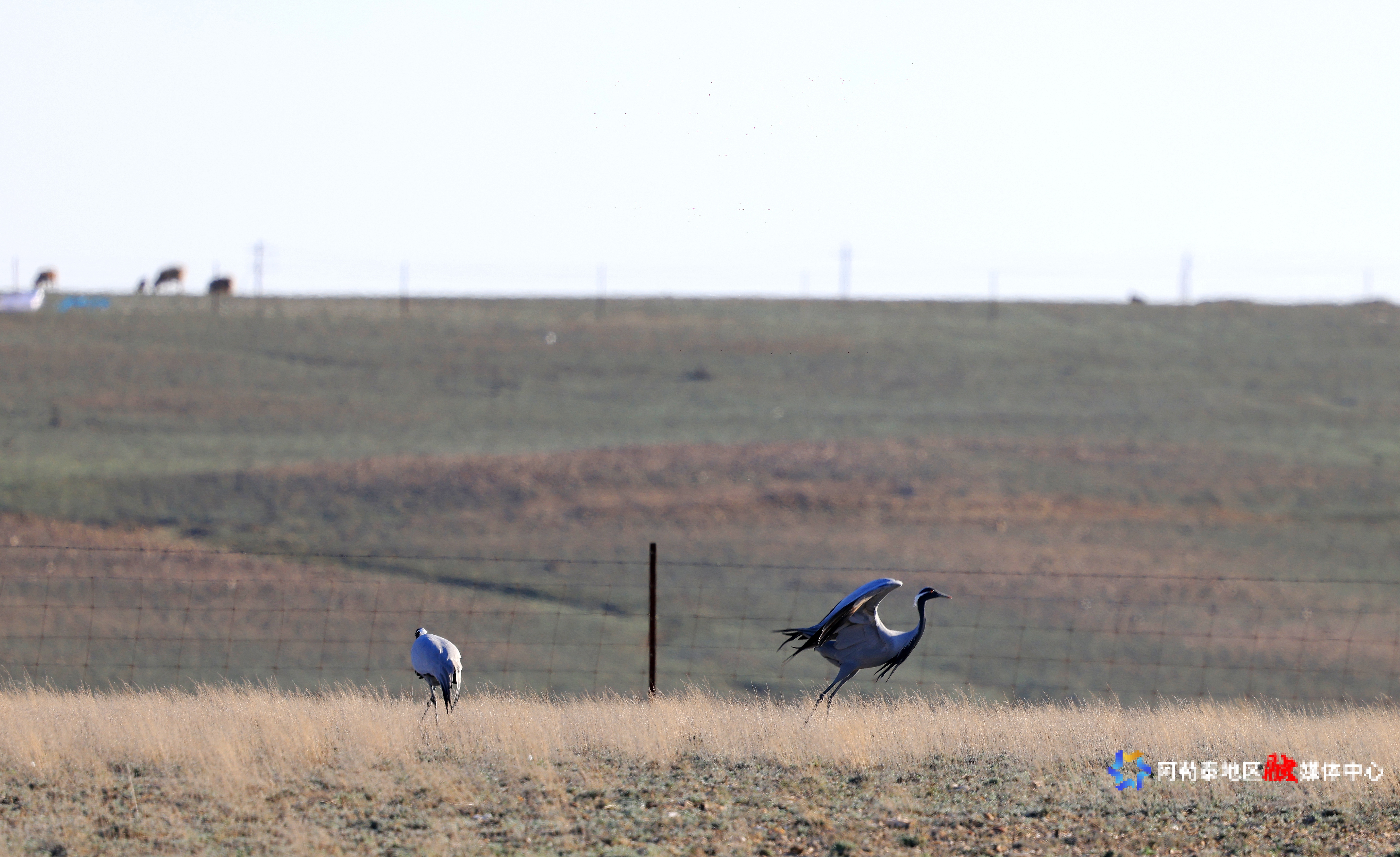 2026年4月16日,蓑羽鹤在阿勒泰市红墩镇草原捕食、飞舞、嬉戏。记者 阿尔达克·拜斯汗摄