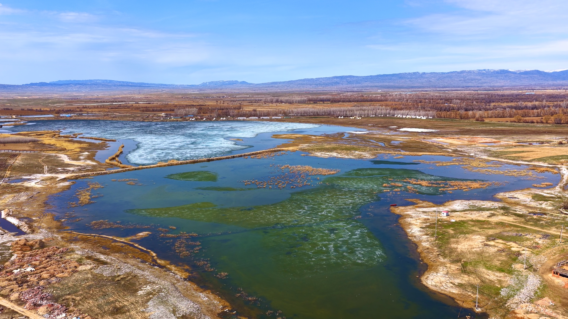 春融残冰,碧波映远山,尽显湿地的辽阔生机。