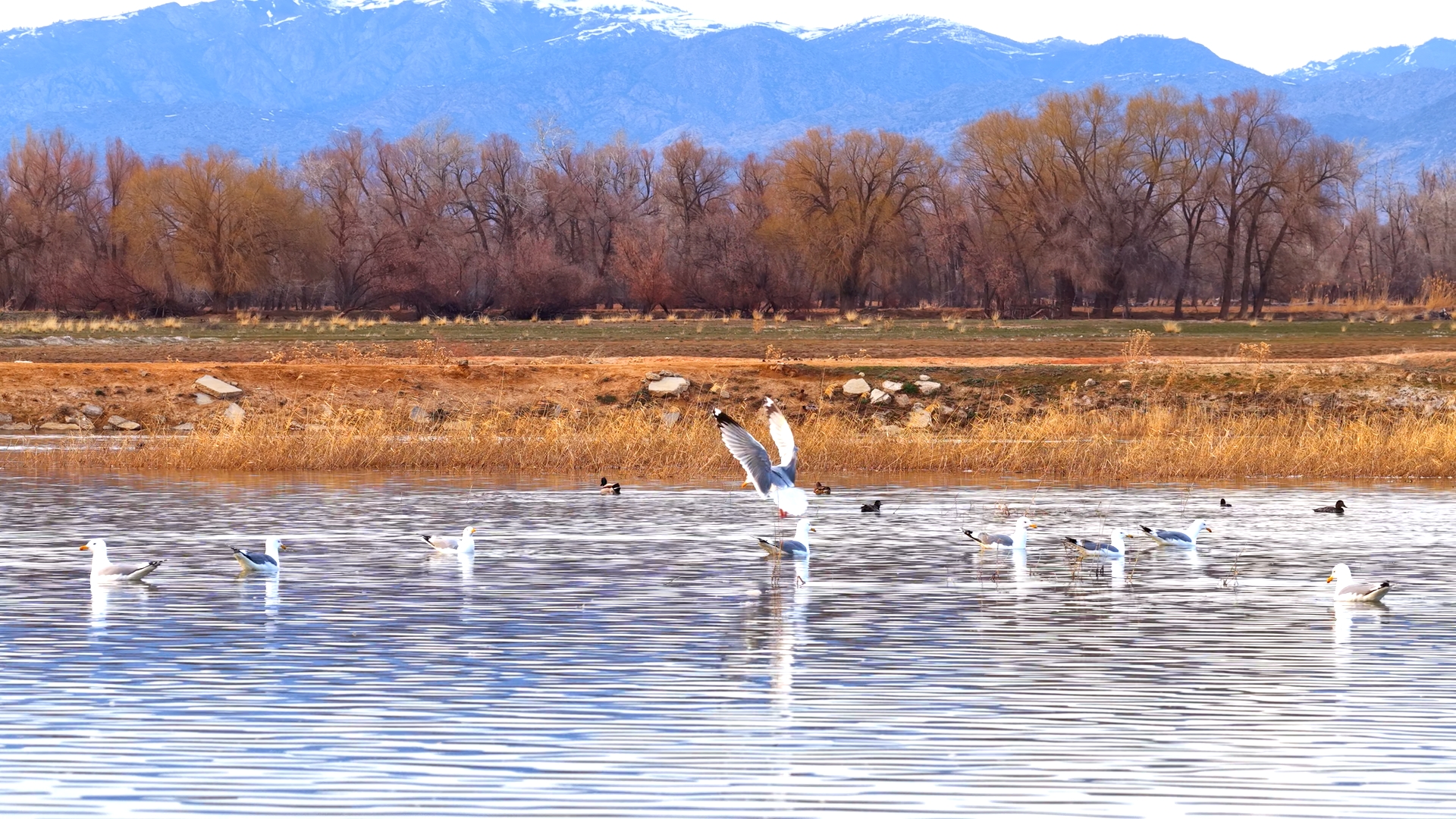 雪山为幕,春水为台,群鸥翔集绘就生态图景。