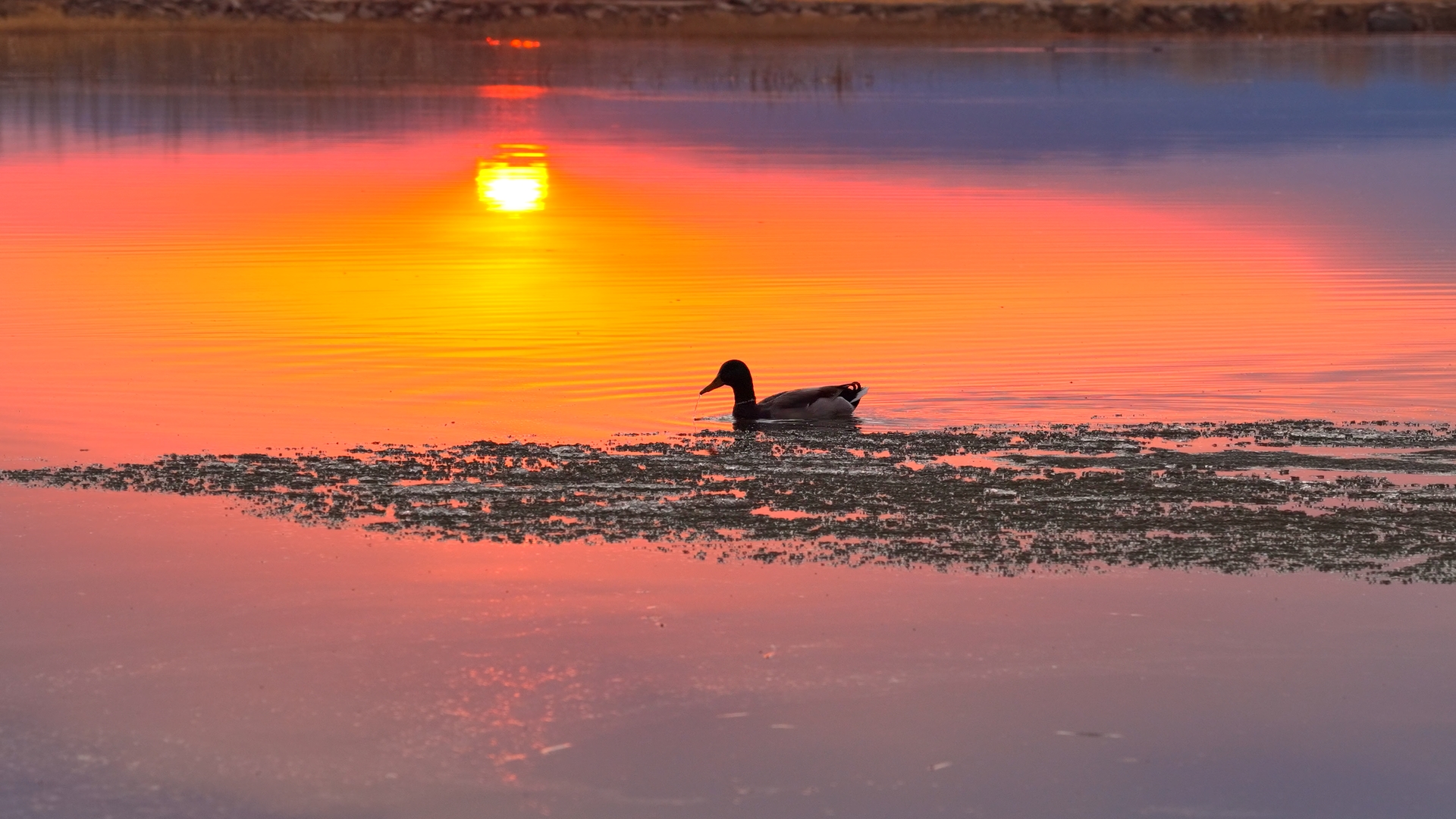 晚霞铺满水面,绿头鸭的剪影划破水面,剪影与霞光相映成趣。