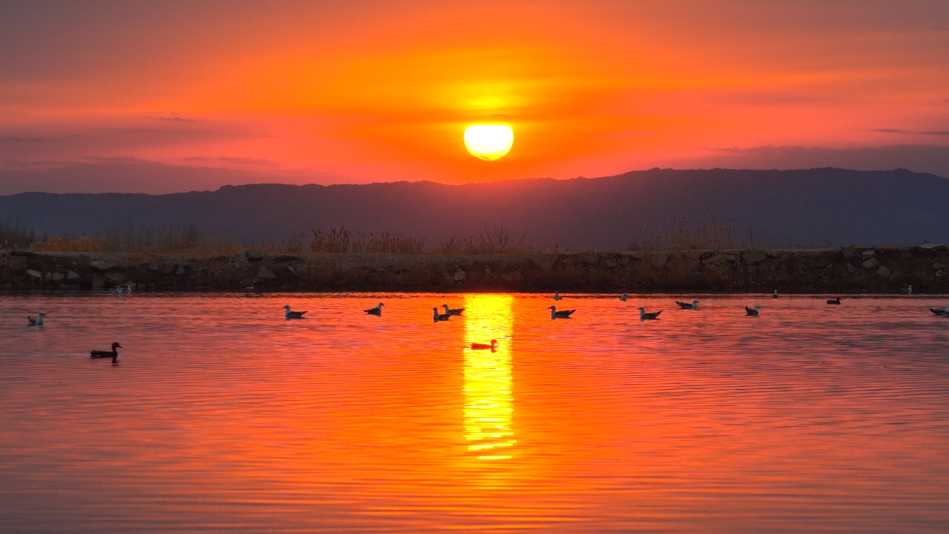 落日熔金,霞光漫染,群鸟逐波,绘就一幅湿地的黄昏盛景。