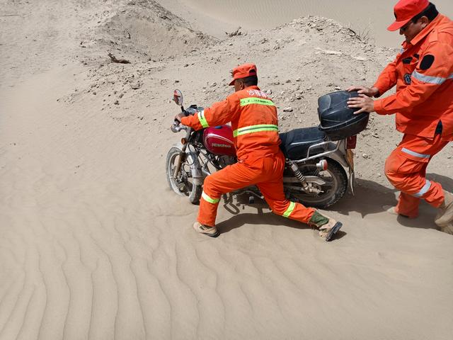 为了近距离查看胡杨树的情况,管护员大多数时候要在林中小路里穿梭。有的地方路况不好,就要推着摩托车步行。第一次外出,缺乏经验的赵文明一只脚踩进了“沙窝子”,沙子没过了小腿肚子。他用力往外拔时,另一只脚没站稳,整个人向后仰倒在沙地里翻了好几个滚。