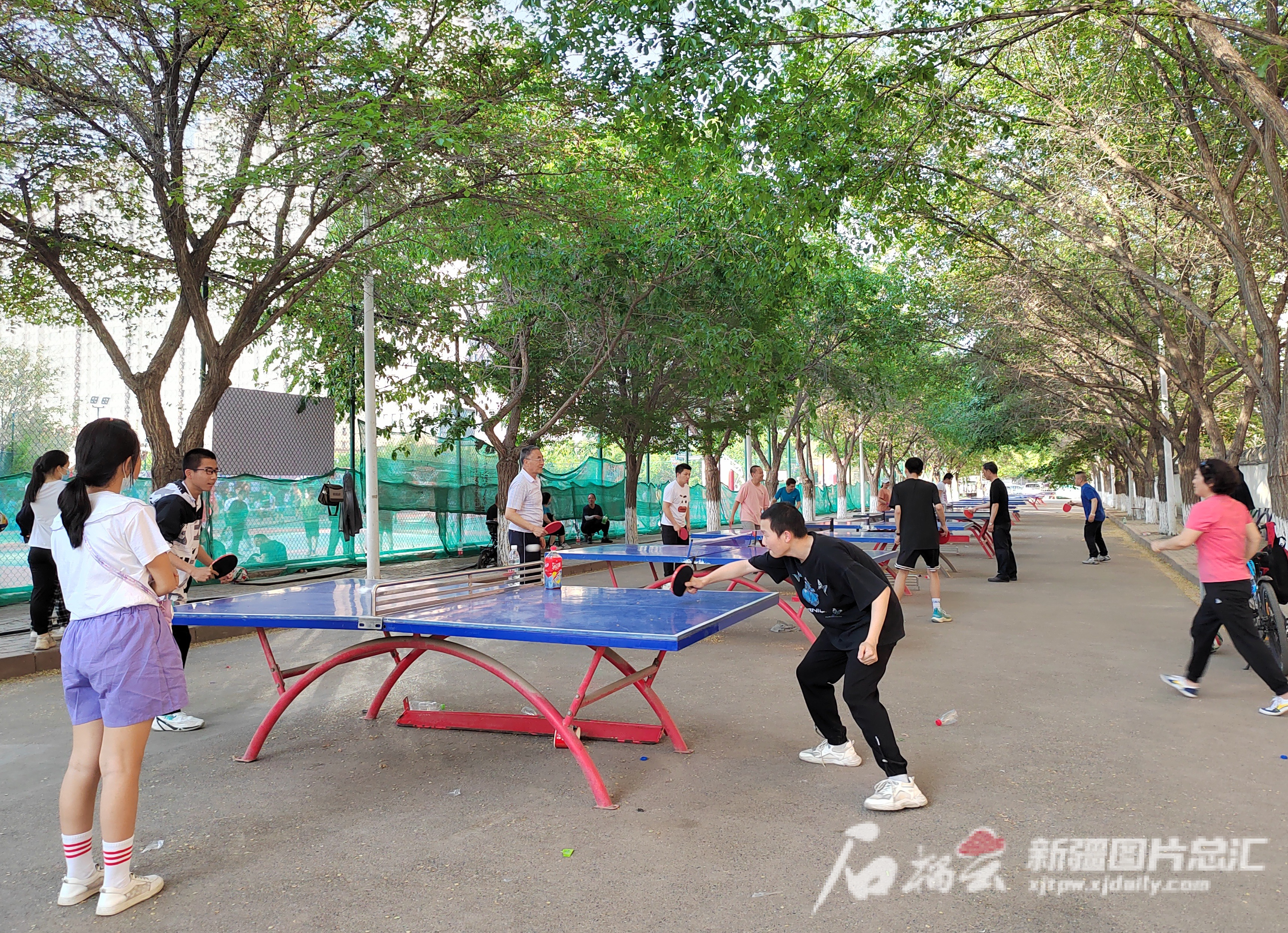 5月13日,乒乓球爱好者在新疆体育中心室外乒乓球场切磋技艺。石榴云/新疆日报记者 董亮摄