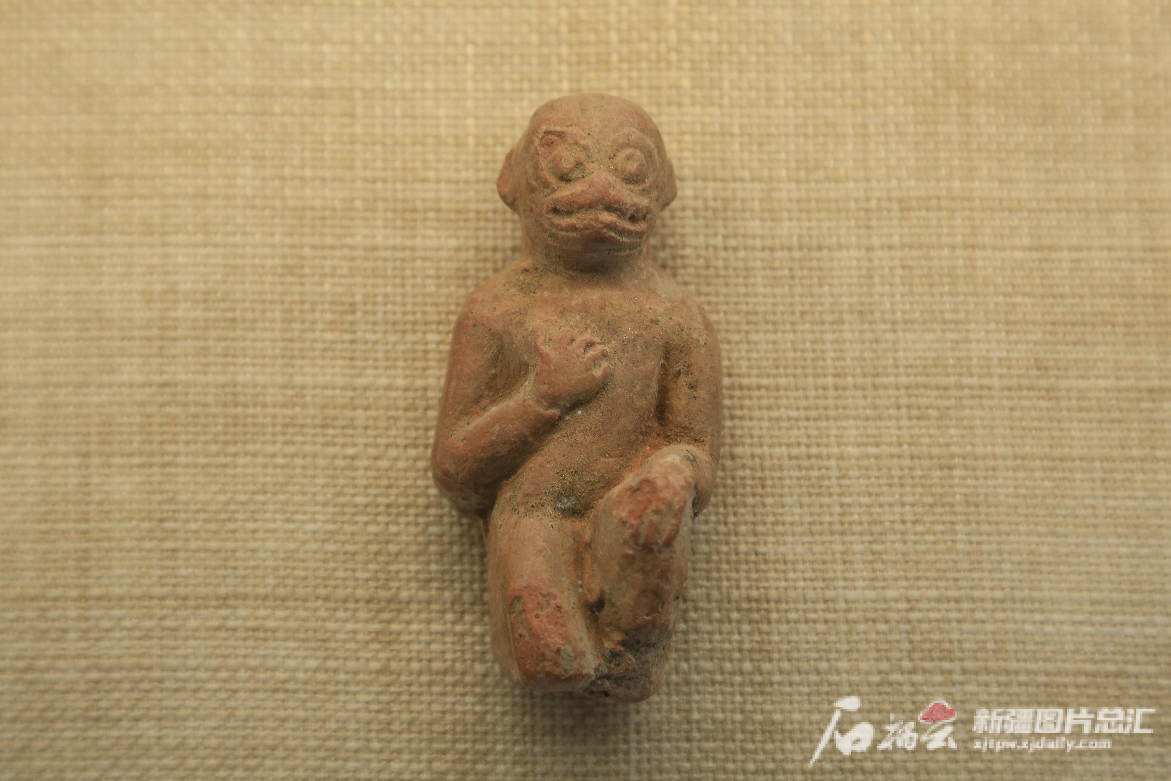 托库孜萨来(唐王城)遗址发掘出土并展出的红陶猴形佛像。贺浩摄