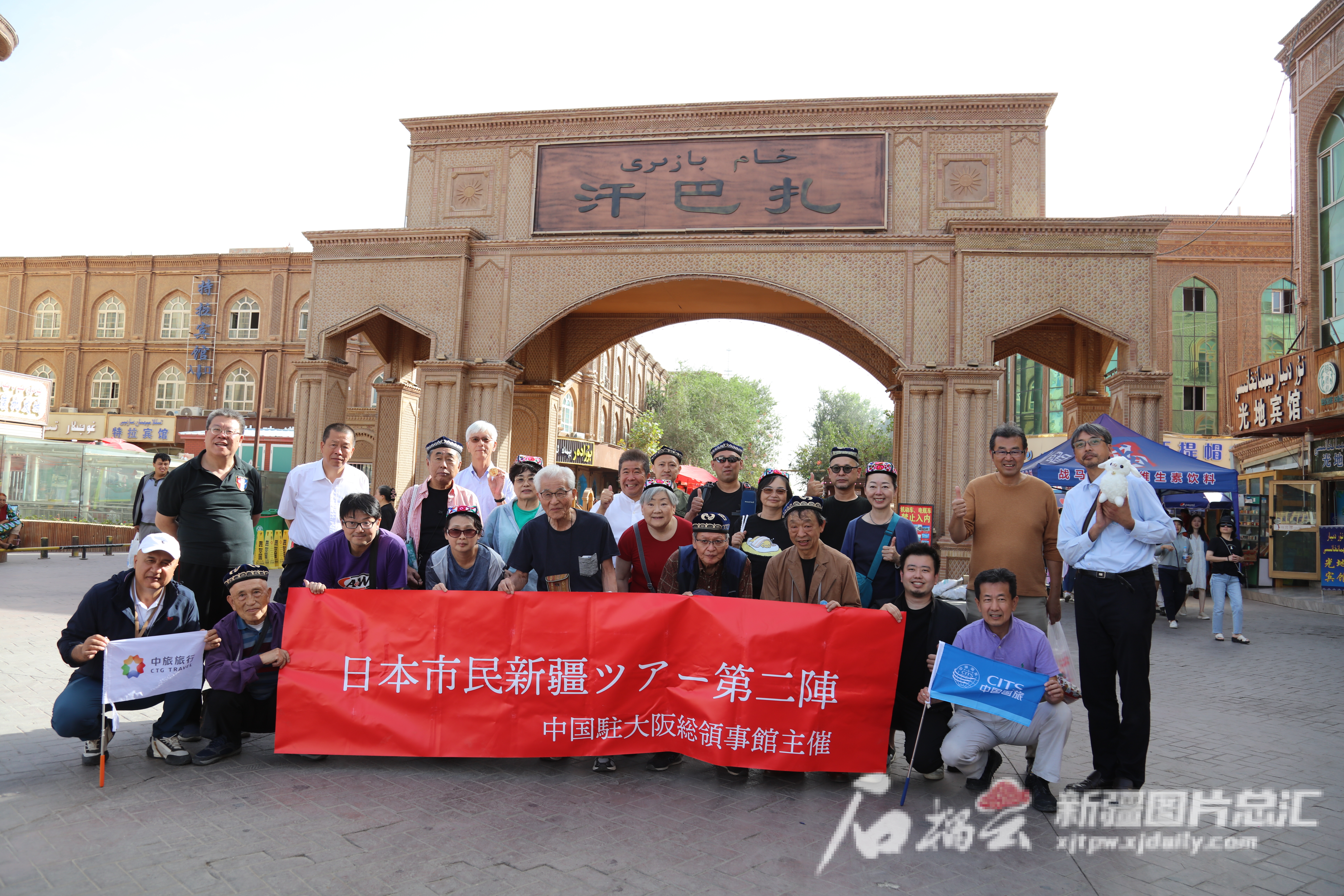 9月8日,“日本市民新疆行”第二批参访团一行在喀什古城汗巴扎美食街合影。陈朝摄