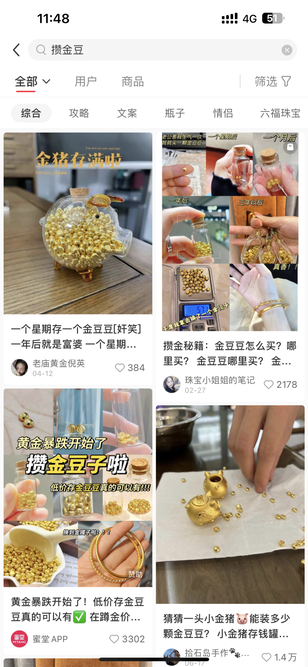 社交平台也掀起“攒金风”。有人把自己攒的金豆拍成照片和视频上传,疯狂“晒金”;有人整理购买攻略,告诉网友哪里能买到好货、哪家店铺要“避雷”;有人分享买豆心情:“开心买一颗,不开心买两颗”“每次老公惹我生气,我就去买一颗金豆子”。