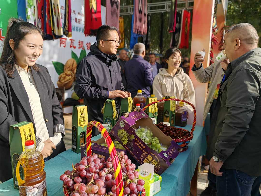 在阿克苏地区阿瓦提县举办的节庆活动上,工作人员在展示特色林果产品。记者 耿丹丹摄