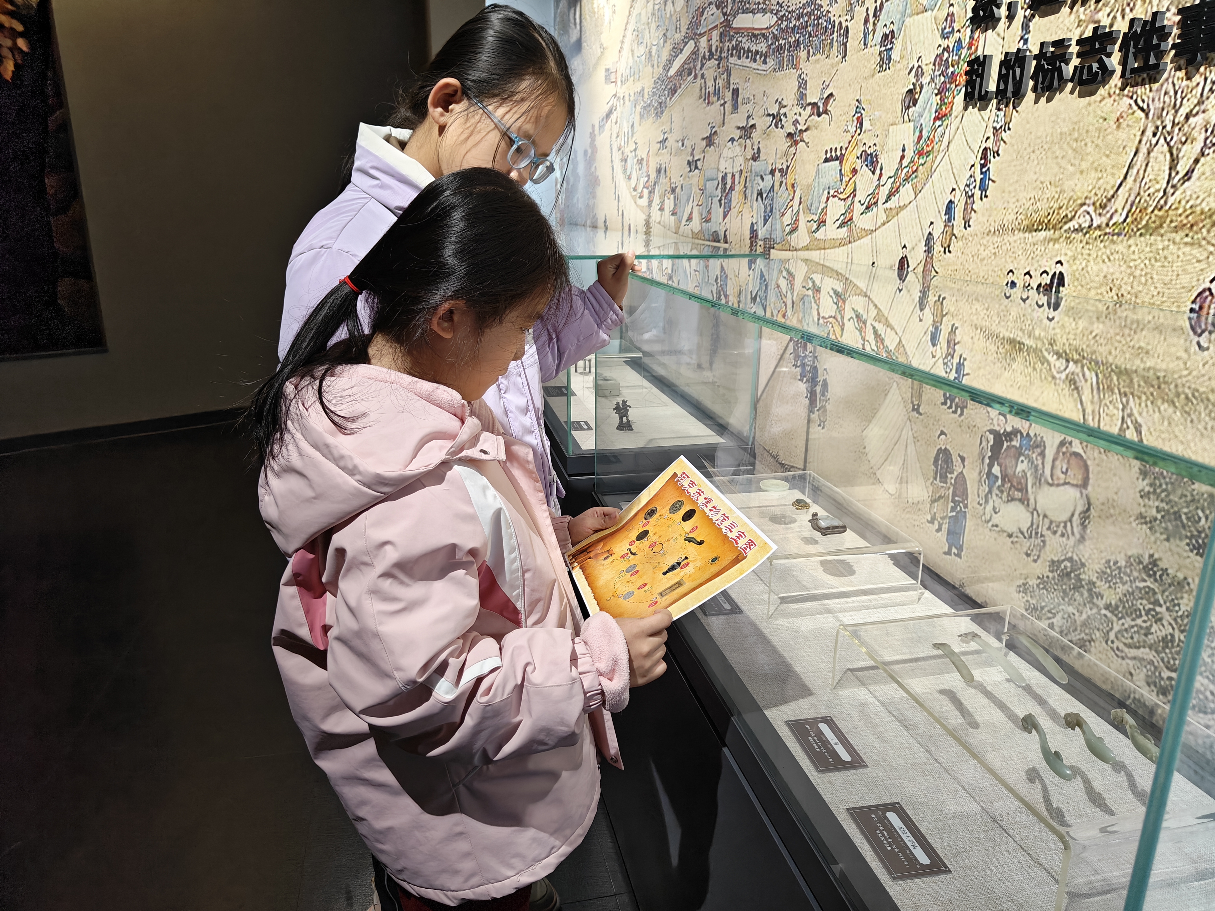 2月6日,阿克苏地区博物馆的《祥龙贺岁——阿克苏地区龙纹文物展》展览现场,小朋友在根据图片指示寻找龙文物。徐涌森摄