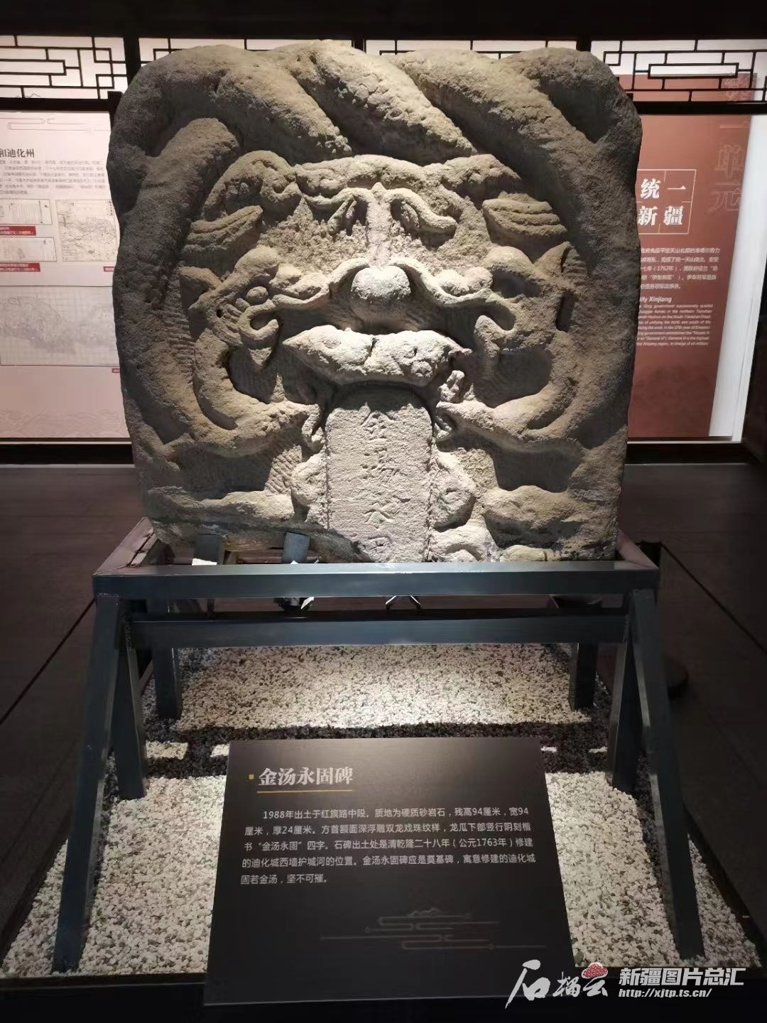 1988年,乌鲁木齐市红旗路中段出土了一尊“金汤永固”碑。其残高94厘米、宽94厘米、厚24厘米,方首额面深浮雕双龙戏珠纹样,龙爪下部阴刻楷书“金汤永固”四字。“这件文物后经考证,出土地点就是1763年修建迪化城西墙护城河的位置。说明它有可能是修建迪化城时的奠基碑,寓意修建的迪化城固若金汤,坚不可摧。”乌鲁木齐市博物馆(市革命历史纪念地管理中心)副馆长李黎说。