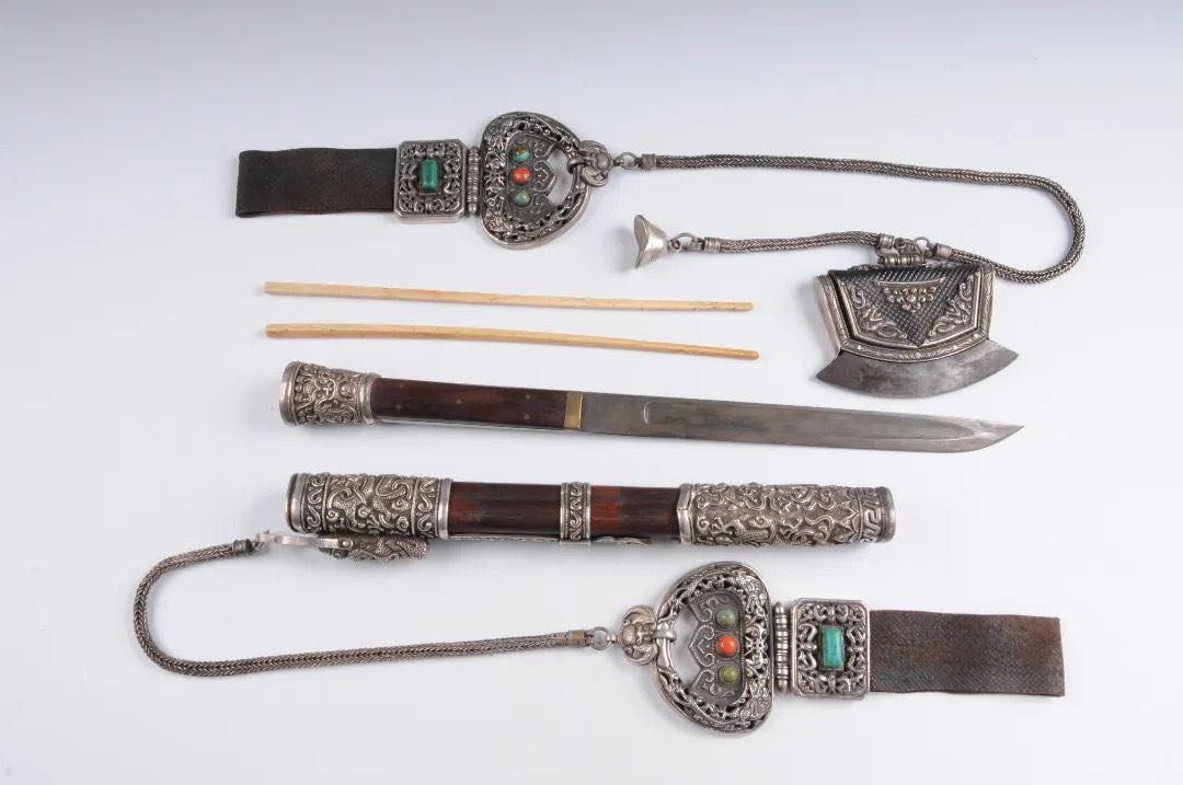 民国时期蒙古族腰刀、火镰和筷子。博尔塔拉蒙古自治州博物馆提供
