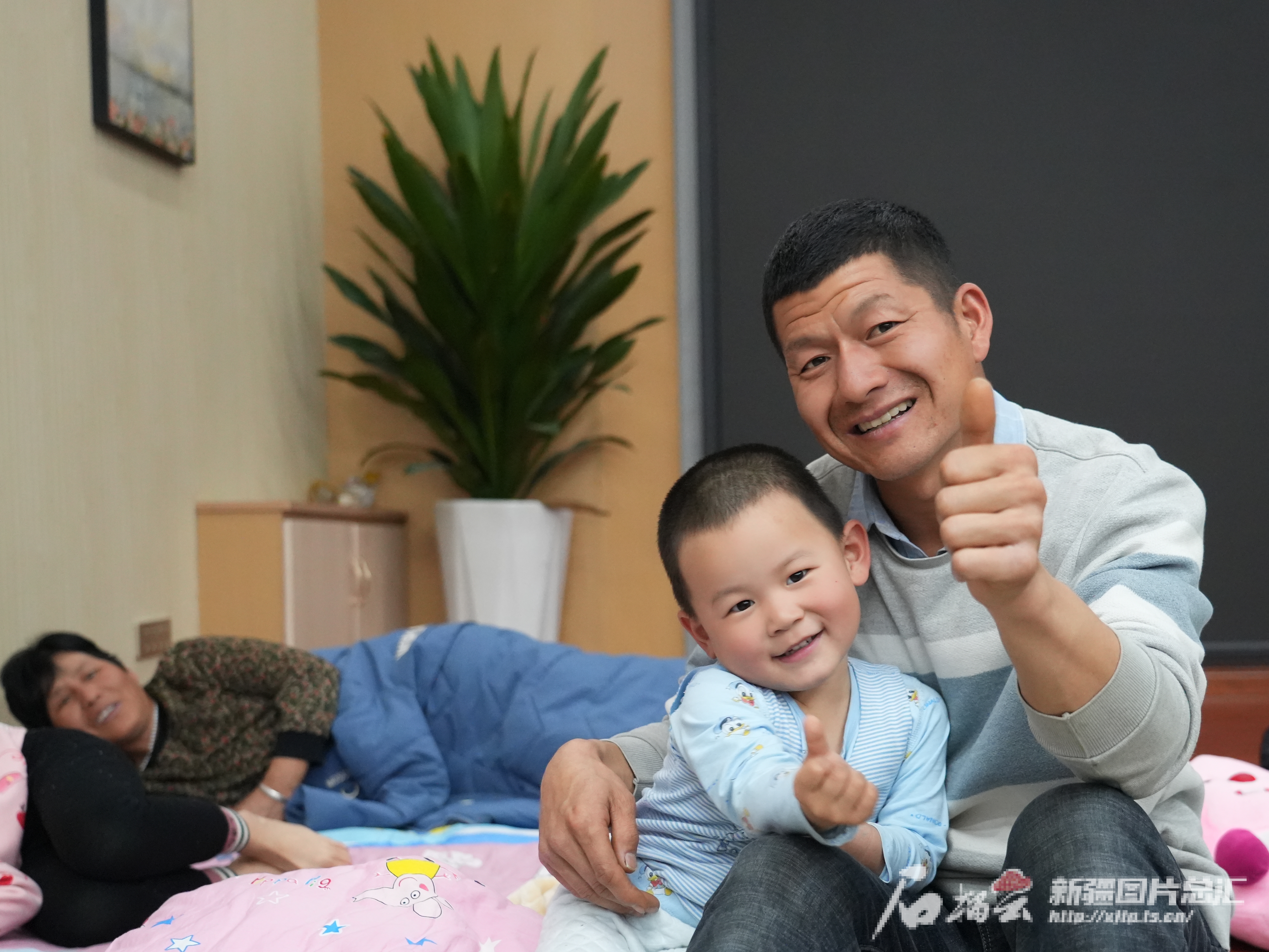 2月17日,从云南省昆明市返疆的薄海峰与亲友7人在哈密市伊州区石油新城街道支油路社区活动室得到妥善安置。这是薄海峰带着孩子给社区干部点赞。麦麦提·玉苏普摄