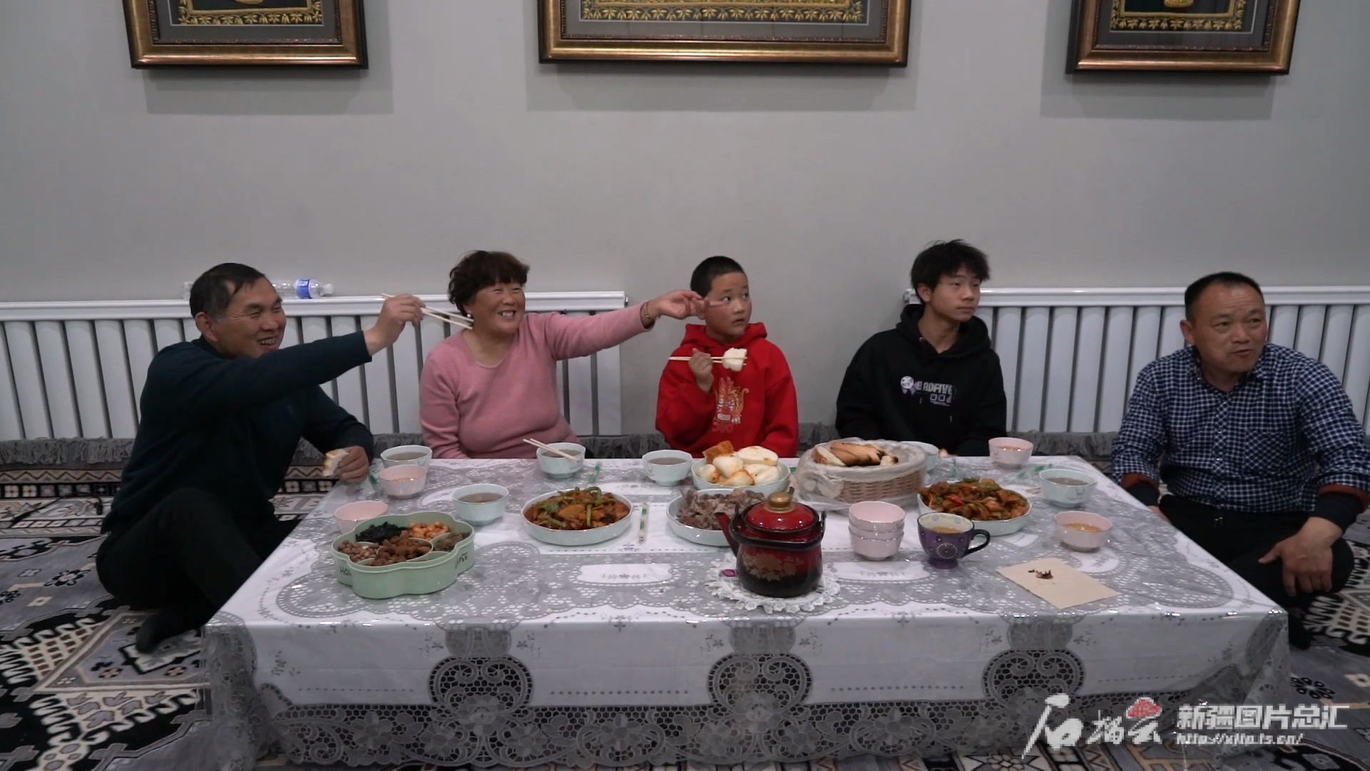 在陶家宫镇上庄子村,村民阿不列孜·阿布列力木迎来了两家来自河南的滞留旅客。晚间,阿不列孜精心准备了清炖羊肉、大盘鸡和八宝粥,大家坐在一起,像一家人一样,品美食、唠家常。