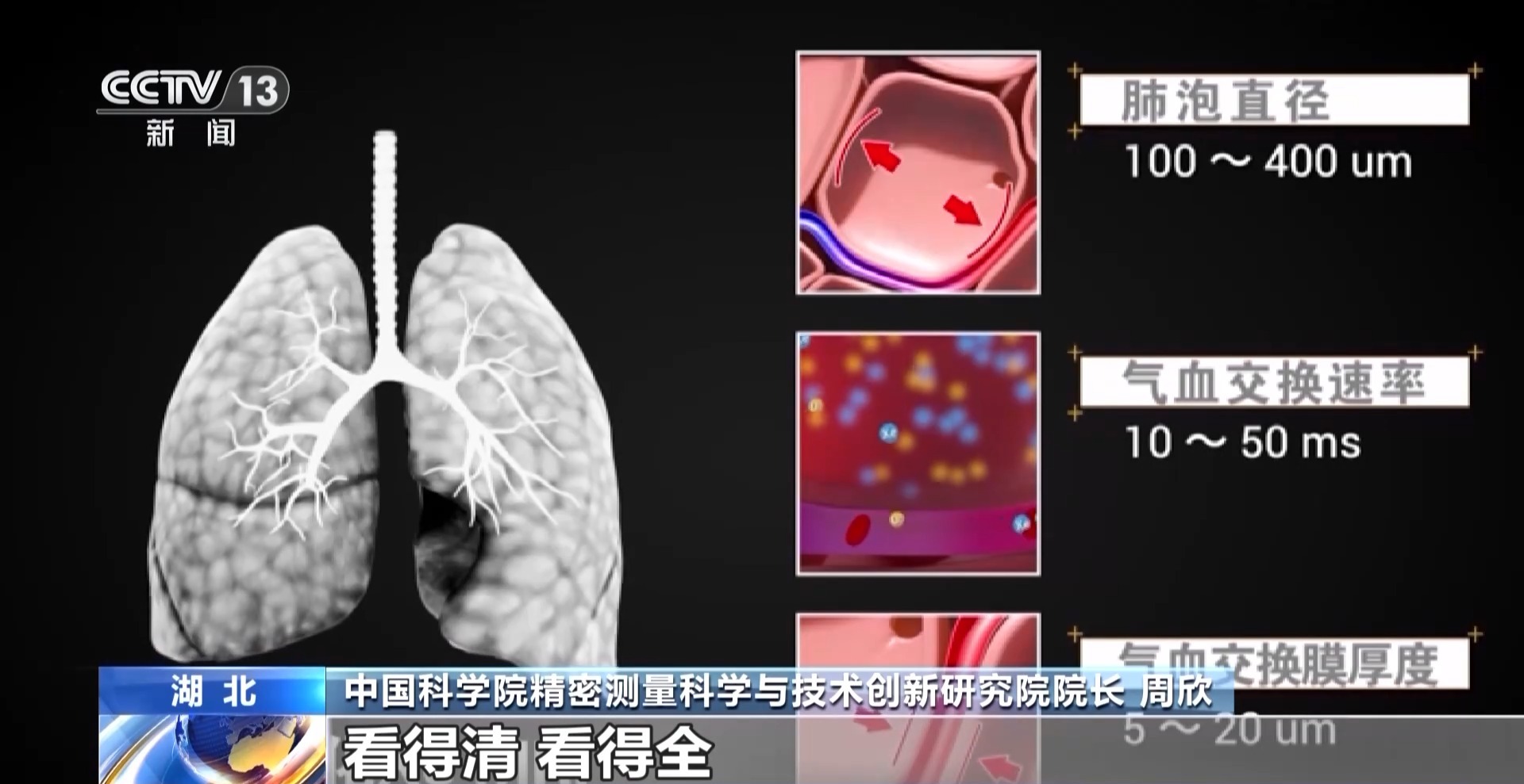 中国科学院精密测量科学与技术创新研究院院长 周欣:从以前看不见到看得见,到现在是看得全,我们现在能够看到这个空间分辨率更高是看得清,像我们以后可能你到医院里面去扫一个肺功能成像,就好像我们现在的血常规一样,看得清、看得全。