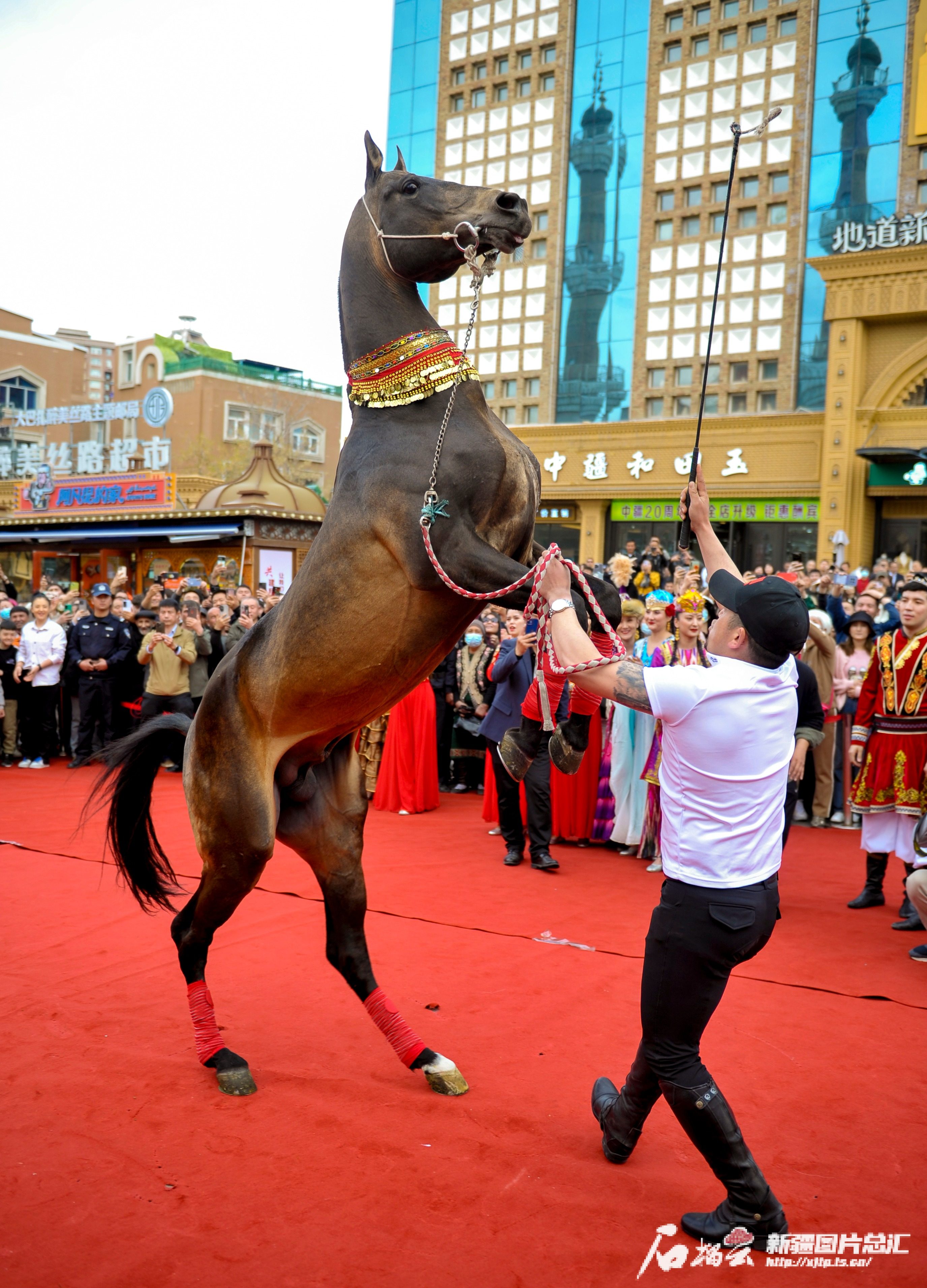 4月11日,在新疆国际大巴扎举行的开街仪式上,汗血宝马在骑手的引导下表演起扬。天山网-新疆日报记者 王禹摄